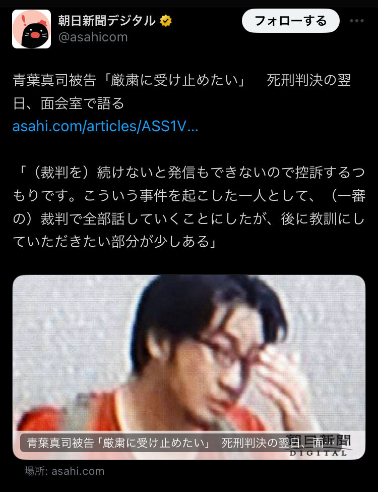 青葉真司「裁判を続けて発信したいので控訴、後に教訓にしていただきたい部分が少しある」