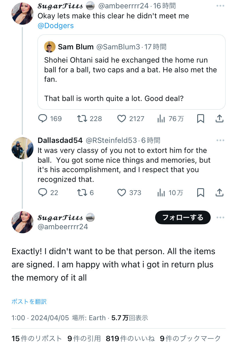 大谷のドジャース初ホームランボールをとった女ファン、大谷には会えなかった模様
