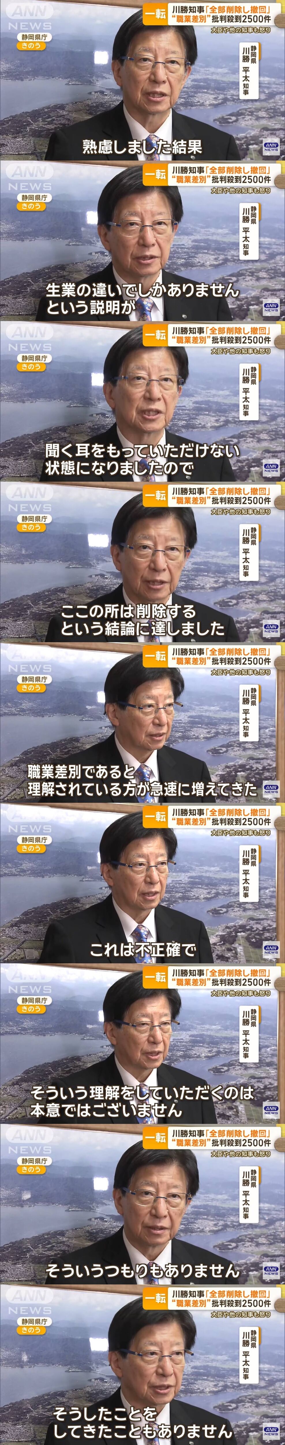 【朗報】川勝・静岡県知事「職業差別であると理解する人が急速に増えてきたため例の発言を撤回します」