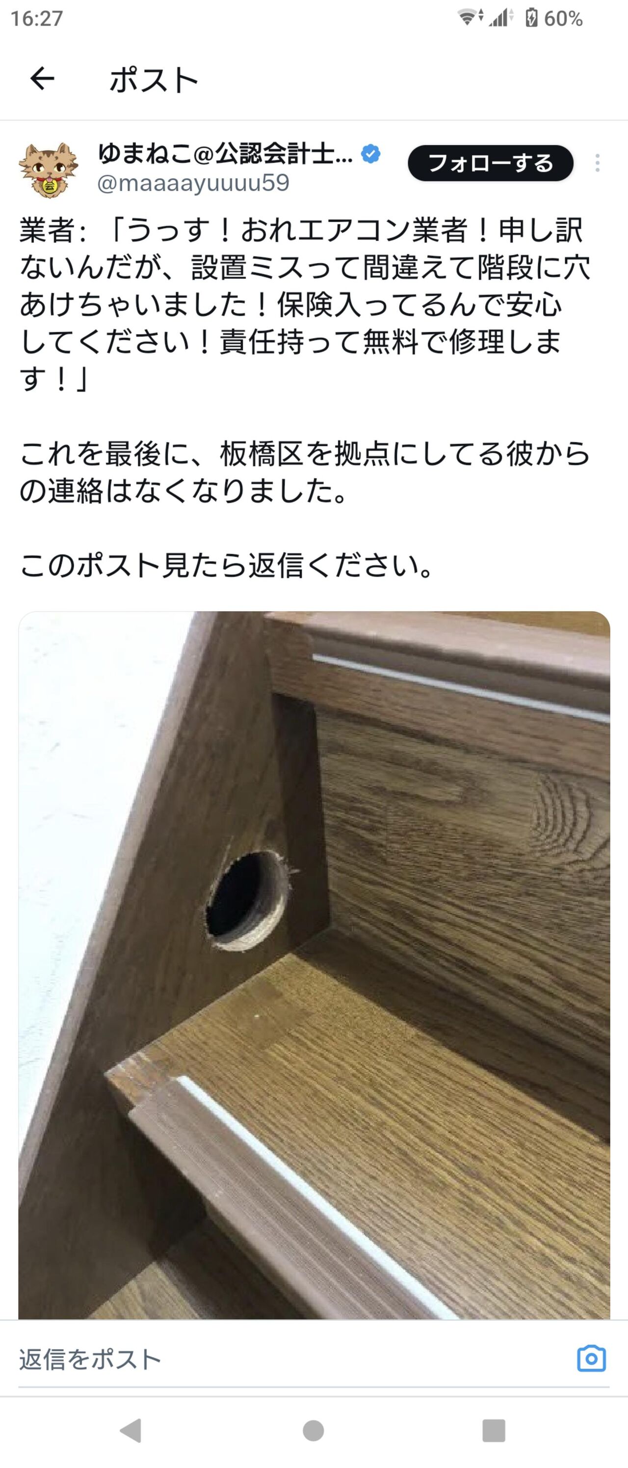 エアコン業者、施工した住宅のやべぇ所に穴を開けたまま音信不通になる