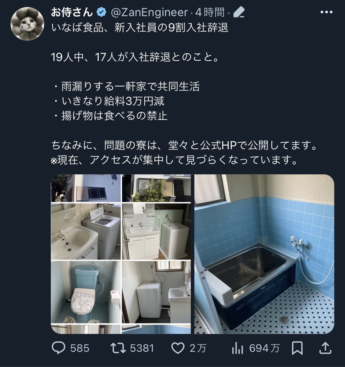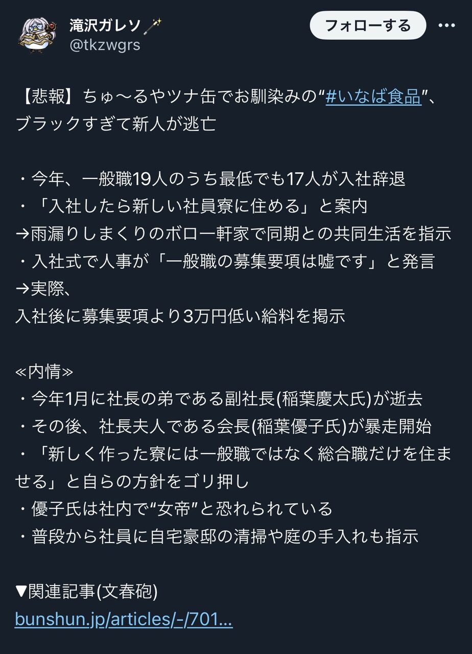 【悲報】いなば食品、新入社員の9割が入社辞退