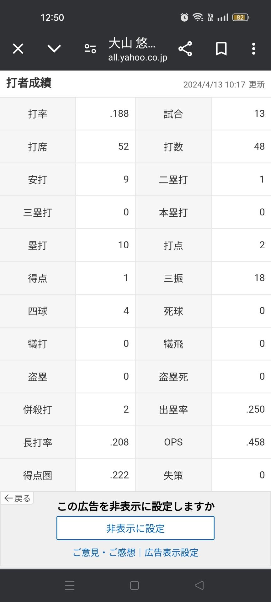 大山悠輔「打率.188(48-9)0本 2打点 OPS.458」←こいつについての率直な感想www