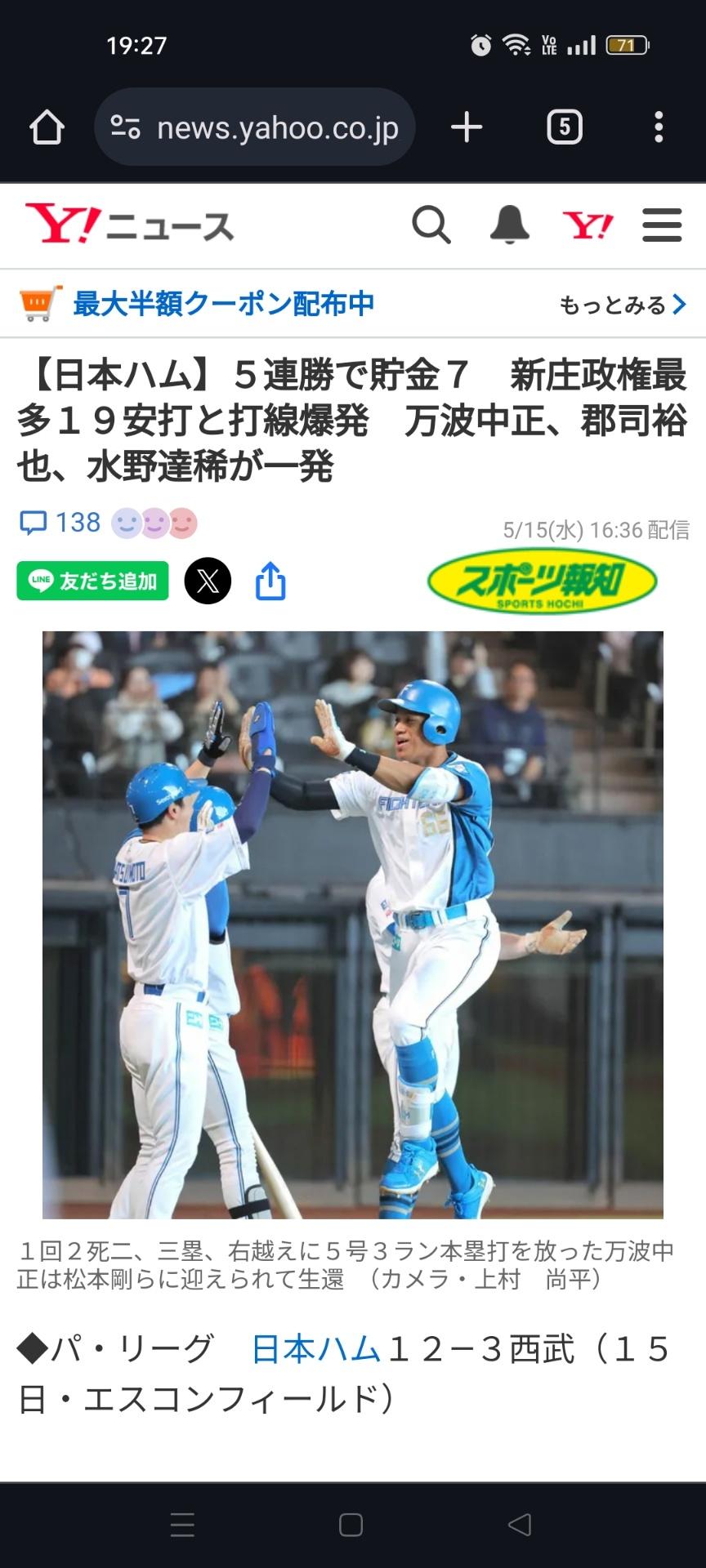 【朗報】ビッグボス日ハムを見事に再建、今季5連勝で貯金7wwwwww