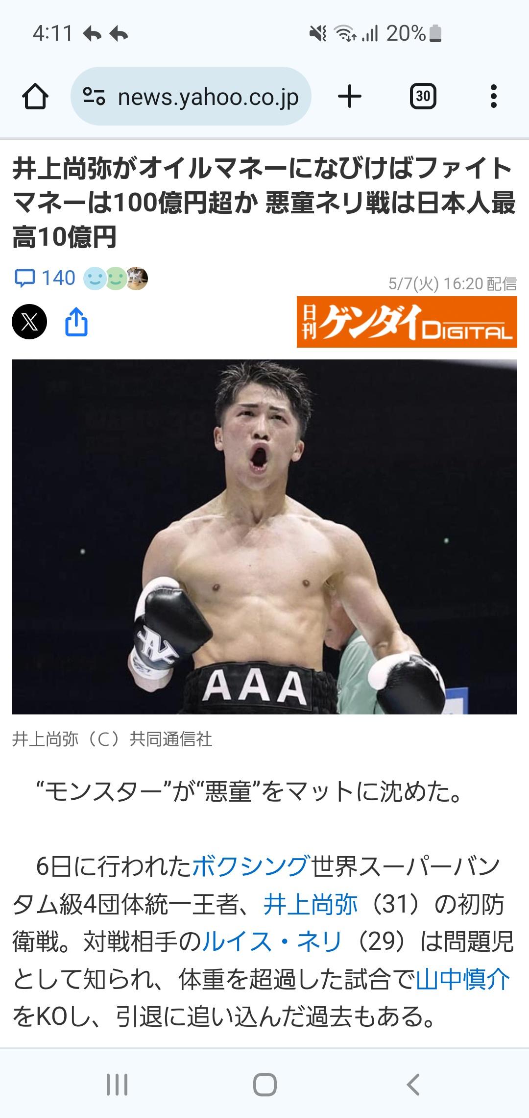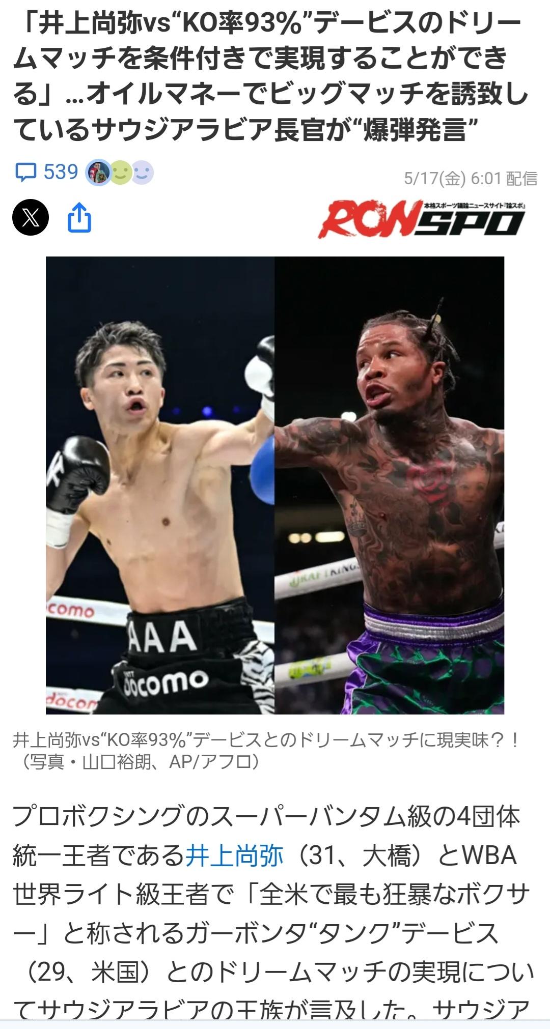 【朗報】石油王「井上尚弥くんがライト級のデービスと試合するならァイトマネー100億円あげるw」