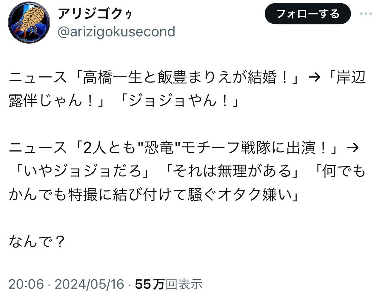 ジョジョ婚だと叩かれないのに特撮婚だと言うと叩かれるっておかしだろ…