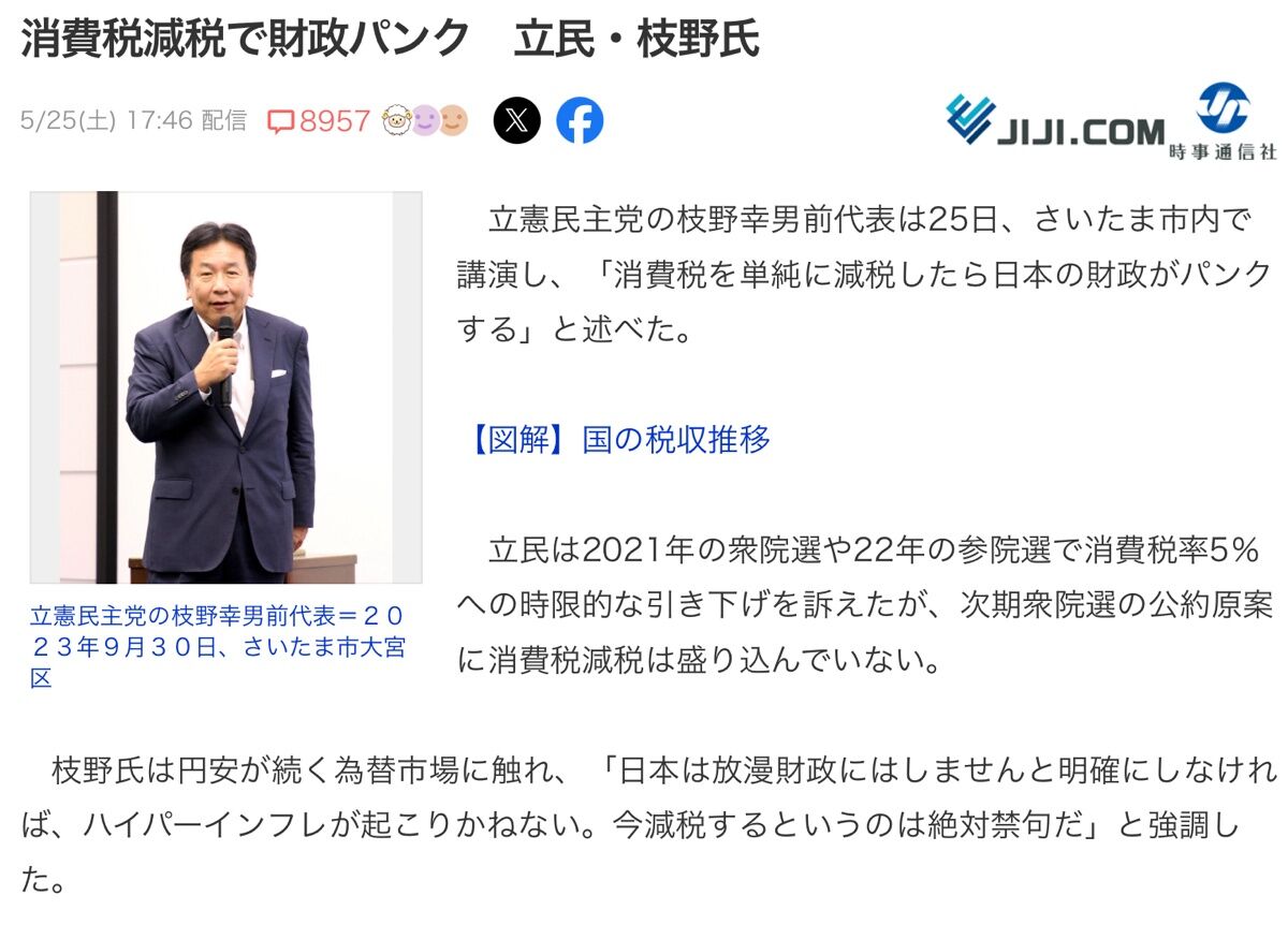 立憲・枝野「いま消費税減税したらハイパーインフレになる」🤔⁉