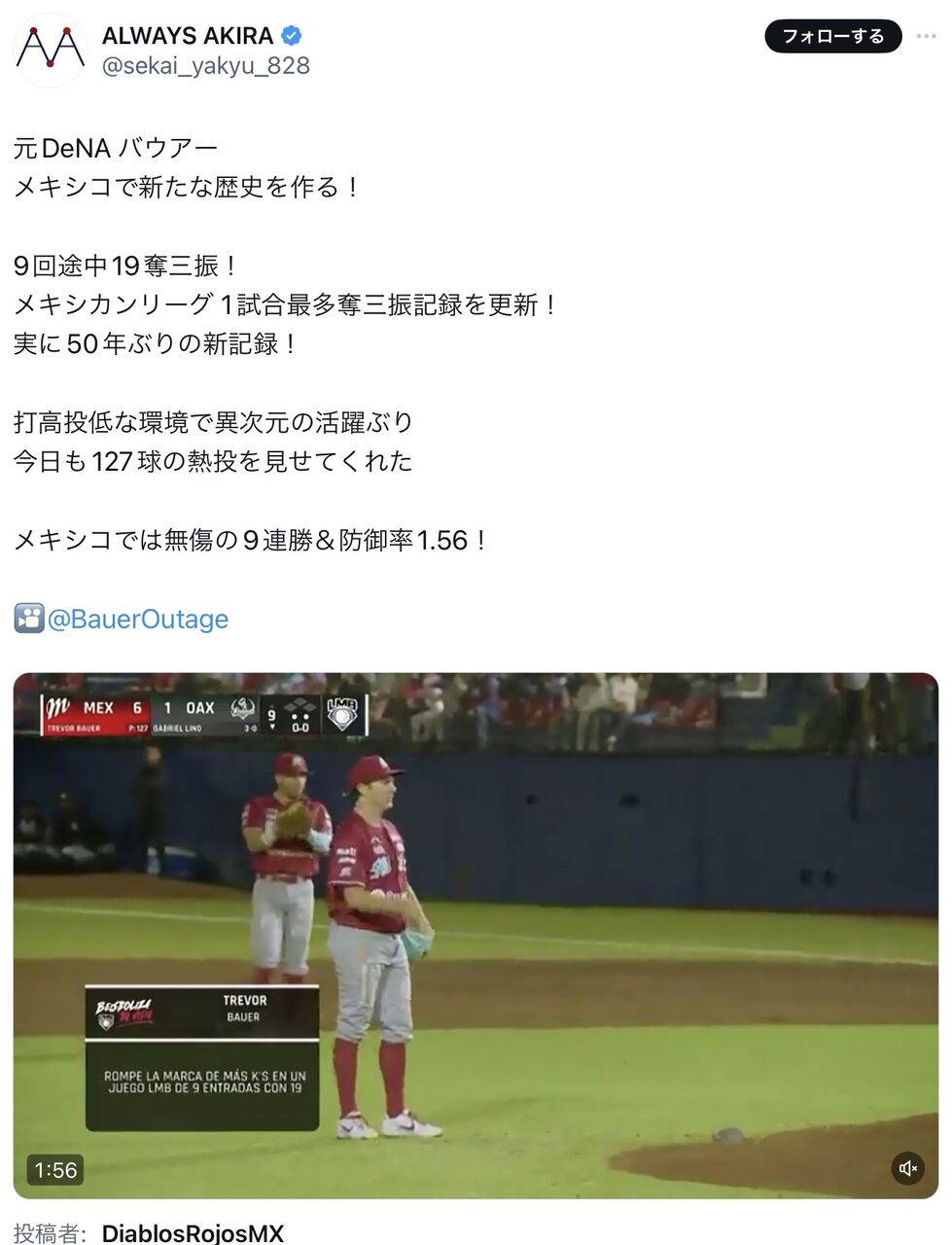【朗報】バウアー、ガチのマジで無双!9勝0敗1.56 1試合19奪三振!