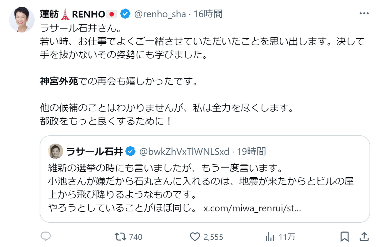 大物芸能人「小池が嫌だから石丸に入れるのは地震が来てビルの屋上から飛び降りるのと同じ」