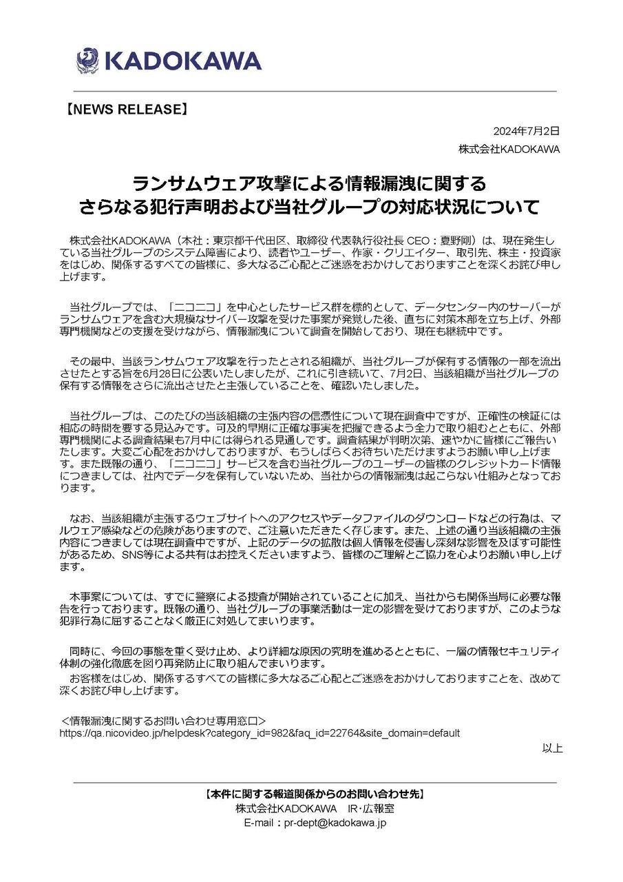 KADOKAWA「クレジットカード情報の漏洩は起こらない仕組みになっております。」