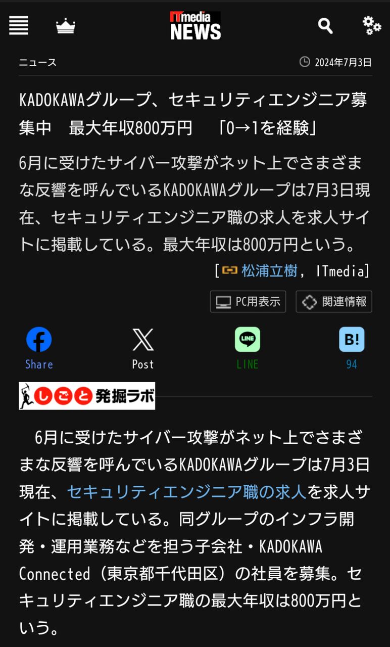 【悲報】KADOKAWAさん、セキュリティエンジニアを高年収で募集してしまうwwwwww