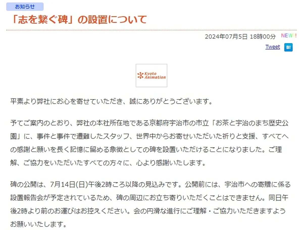 京都アニメーション「志を繋ぐ碑」公開へ