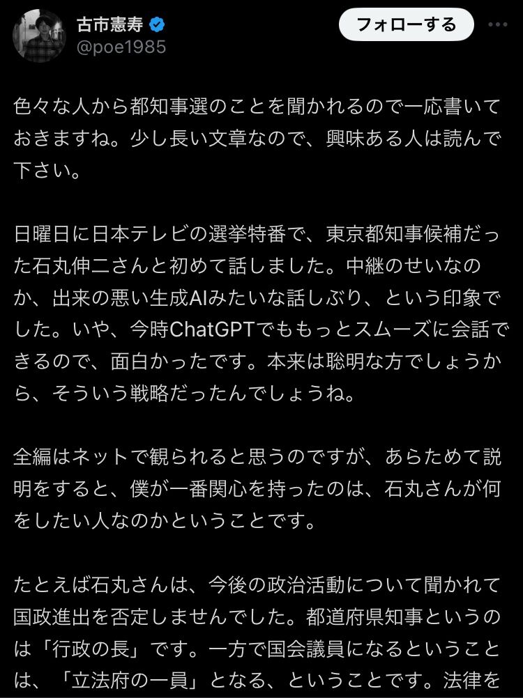 古市憲寿「石丸伸二は出来の悪いAIみたいだった」