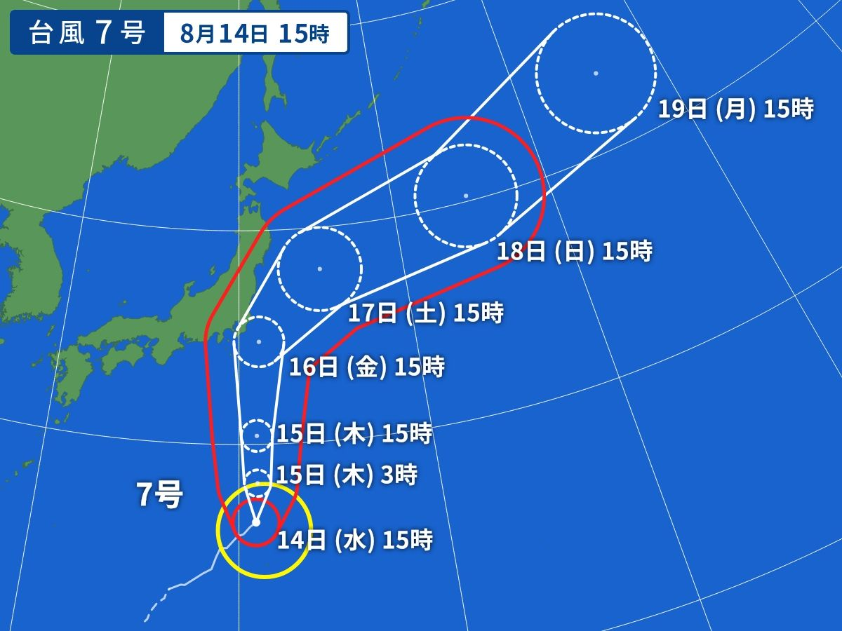 台風7号は14日(水)正午現在、父島の西南西約190キロにあって、時速10キロで北東へ進んでいます。