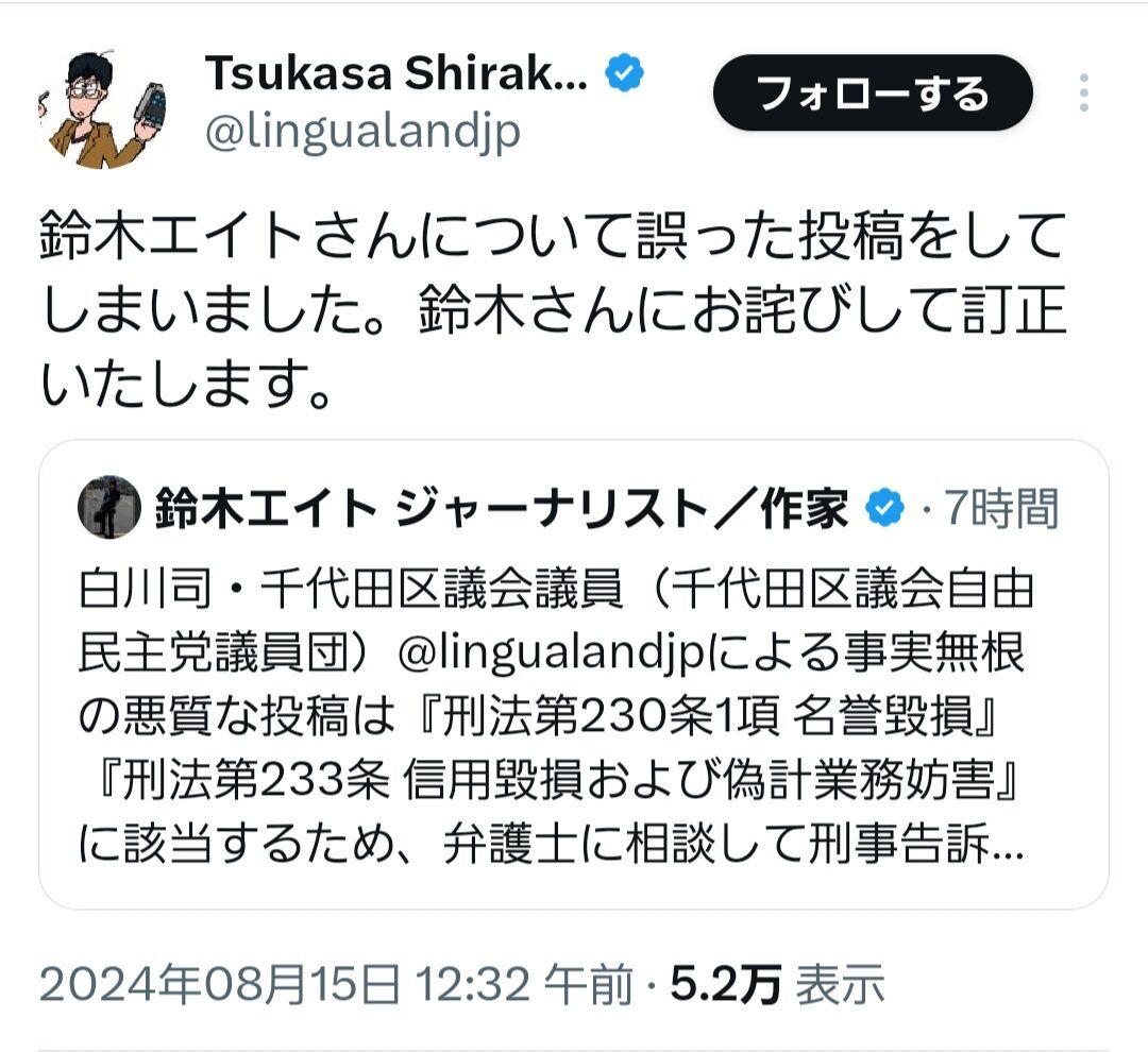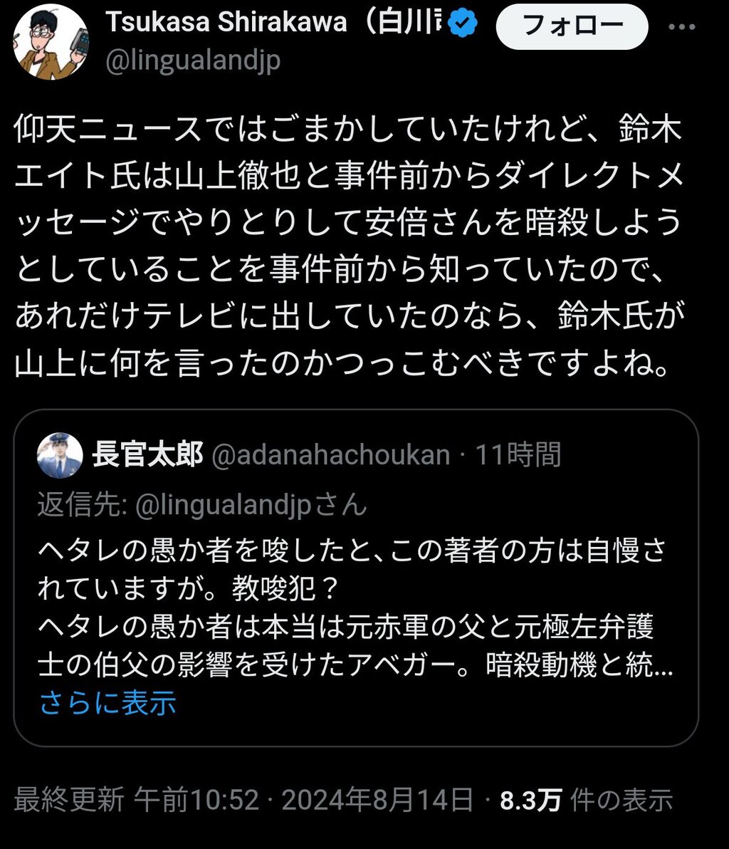 【悲報】自民党議員「鈴木エイトは事件前から山上とやり取りしてて、襲撃計画も事前に知っていた」