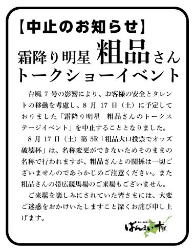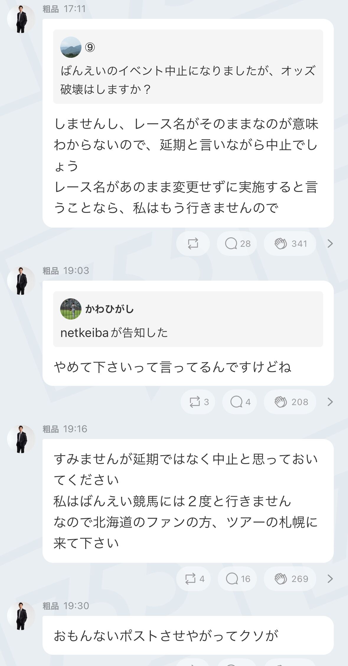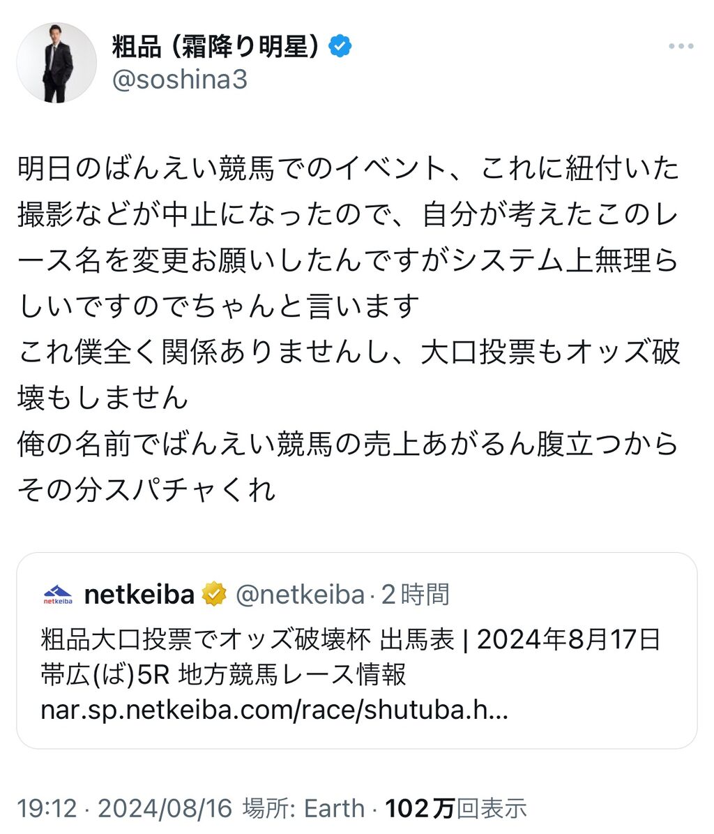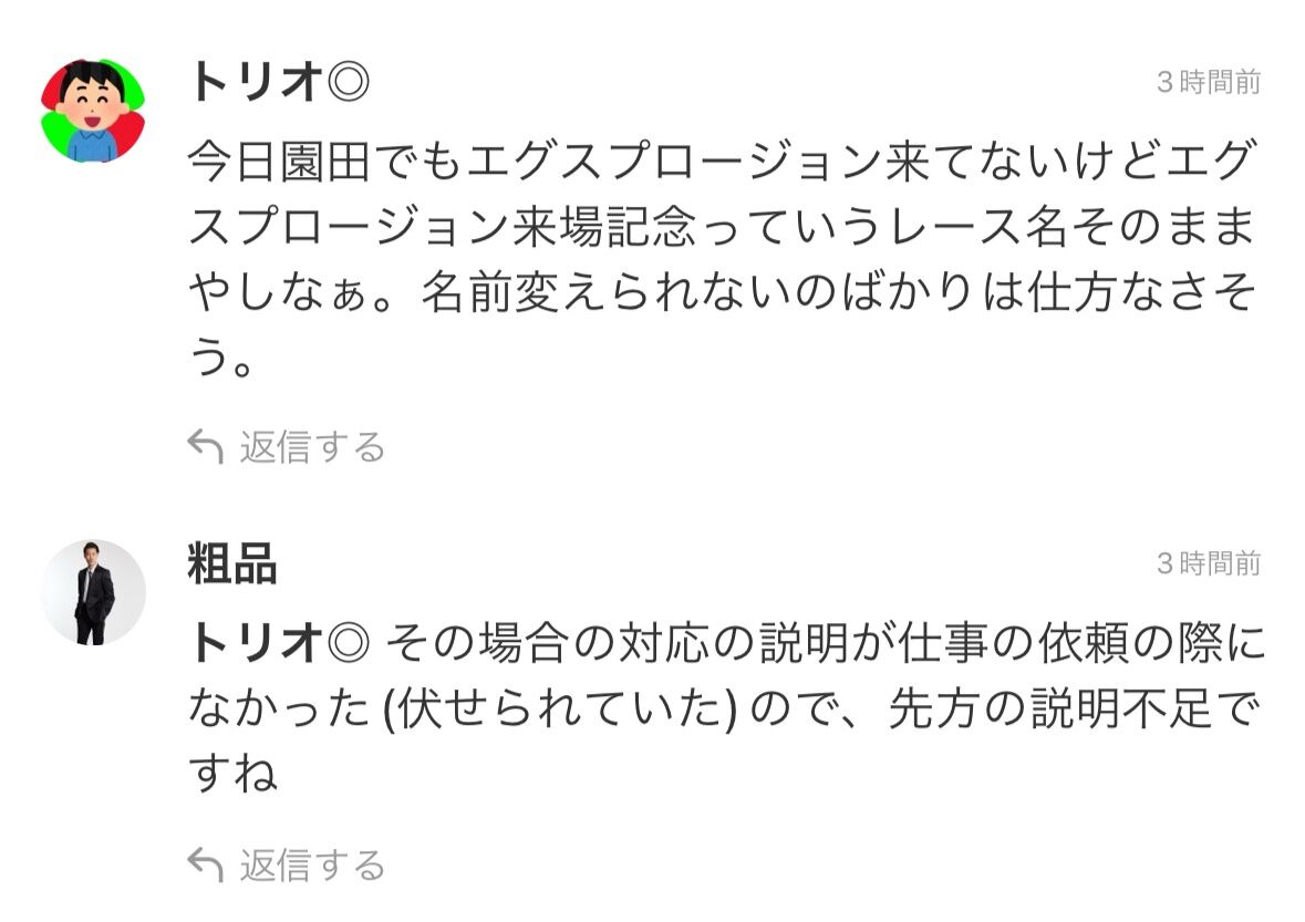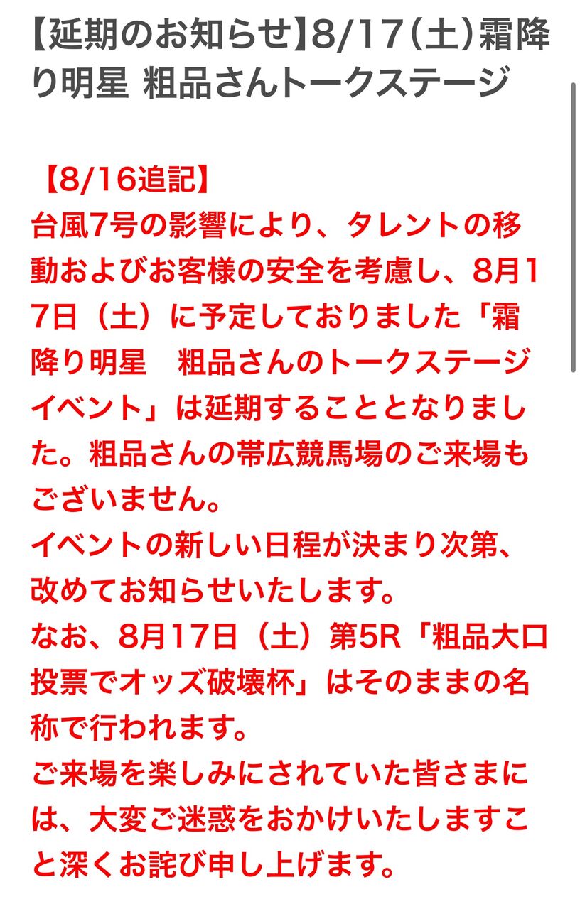 粗品「イベント延期ならレース名も変更してと言ったが無理と言われた、延期って言ってるけどばんえい競馬には2度と行かないので中止と思っといて」