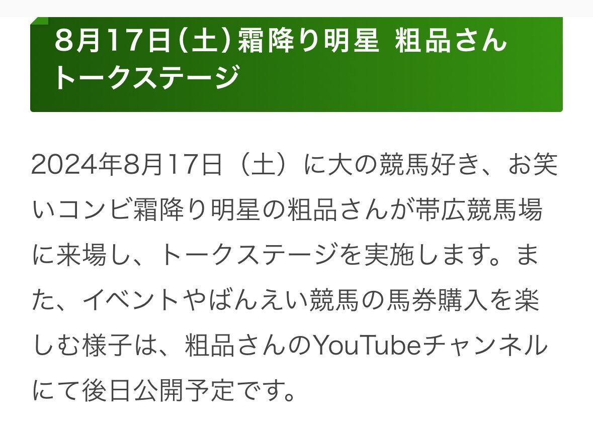 ばんえい競馬にて粗品協賛で第5R「粗品大口投票でオッズ破壊杯」というレース名をつけYouTube撮影やトークイベントを行う予定だった