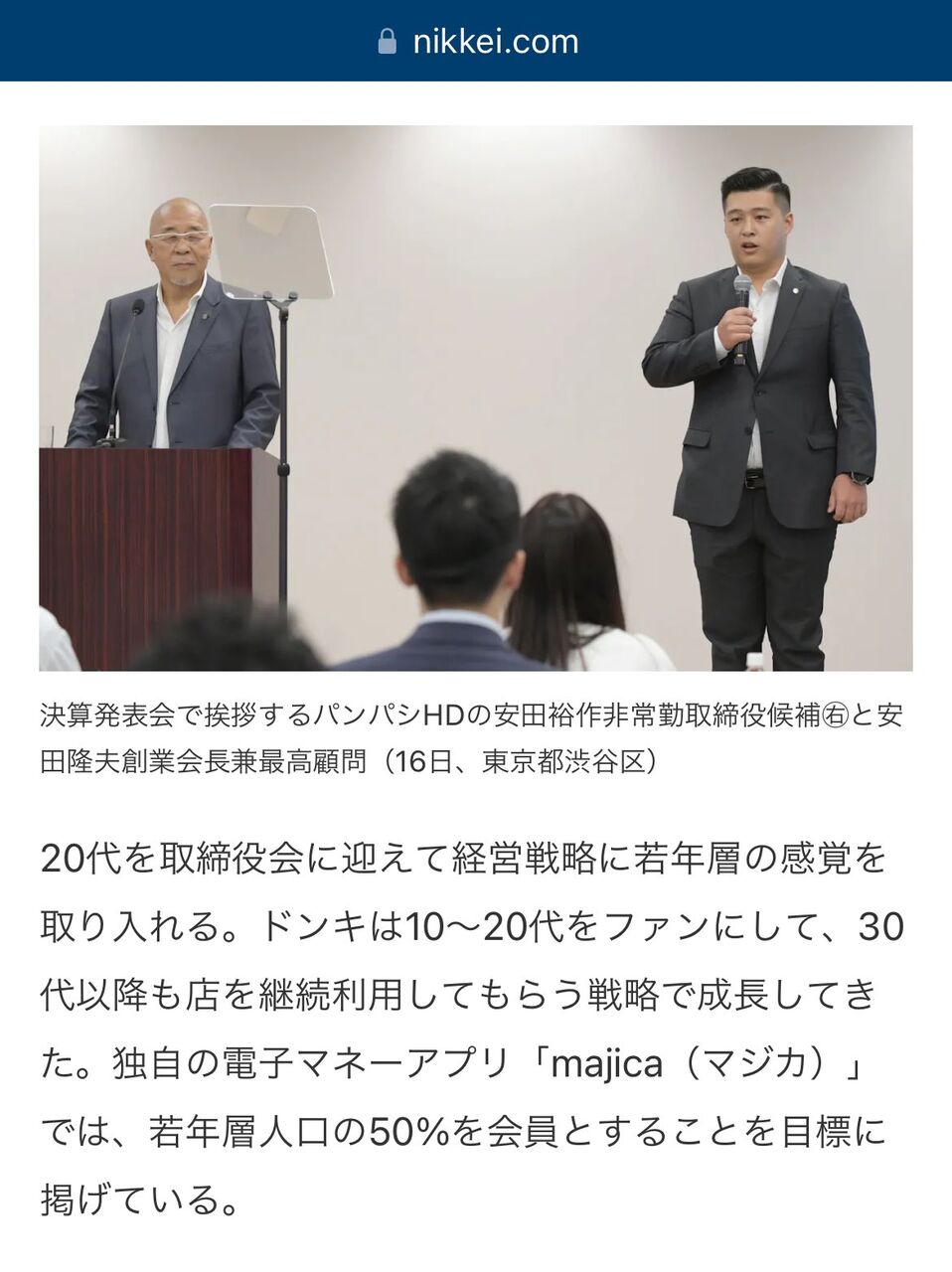 ドンキのパンパシHD、安田会長の22歳息子を取締役選任https://www.nikkei.com/article/DGXZQOUC1537E0V10C24A8000000/