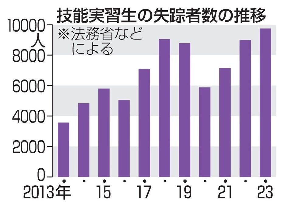 劣悪な職場環境などが原因で勤務先から姿を消す外国人技能実習生が相次いでおり、政府は10月にも対策強化に乗り出す。法務省関係者によると、2023年の失踪者は速報値で9753人に上り過去最多を更新。職場を移る「転籍」が原則認められず、増加の一因とされてきた。運用要領を見直し、パワハラやセクハラを受けた場合は転籍可能などと明記する。