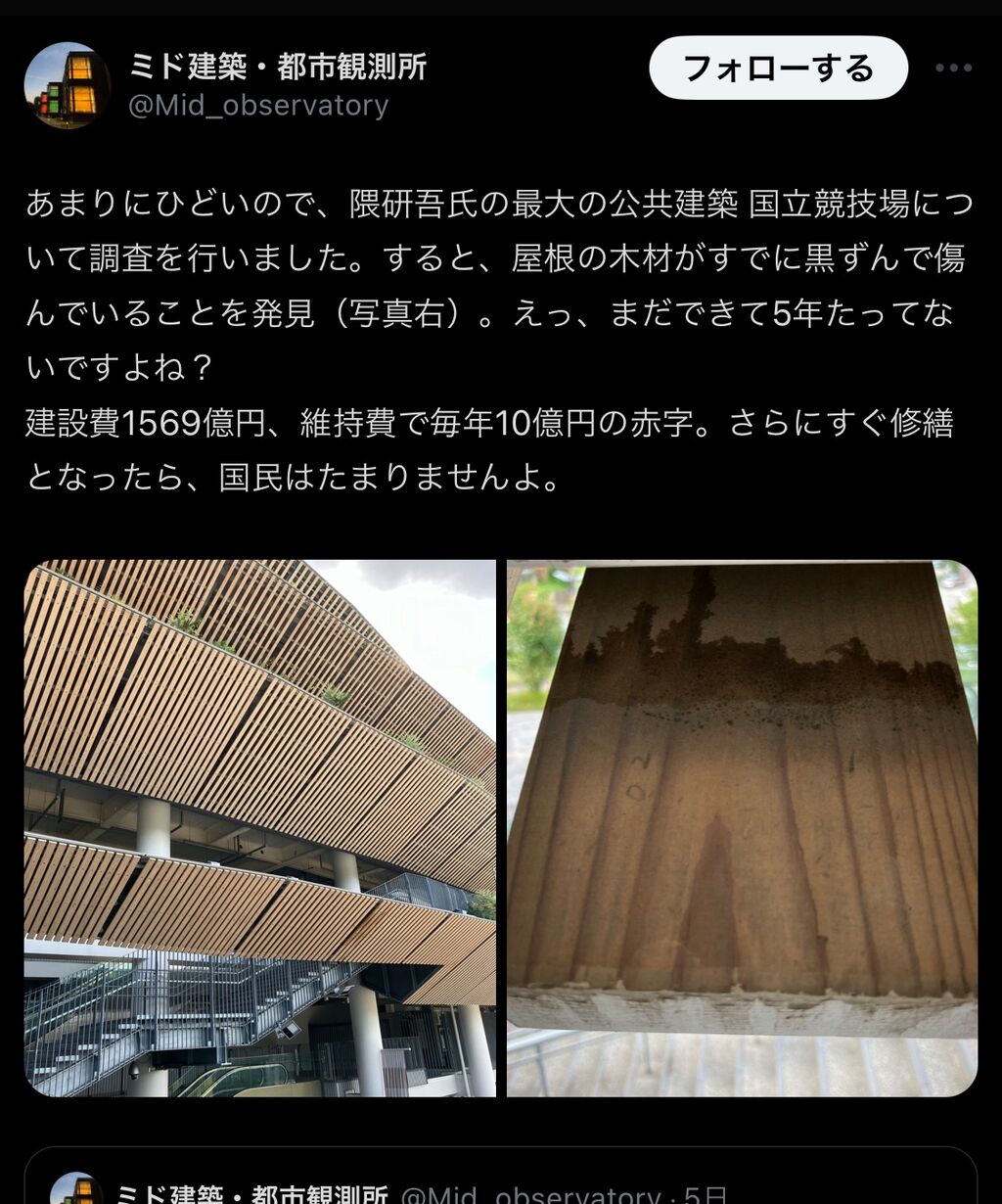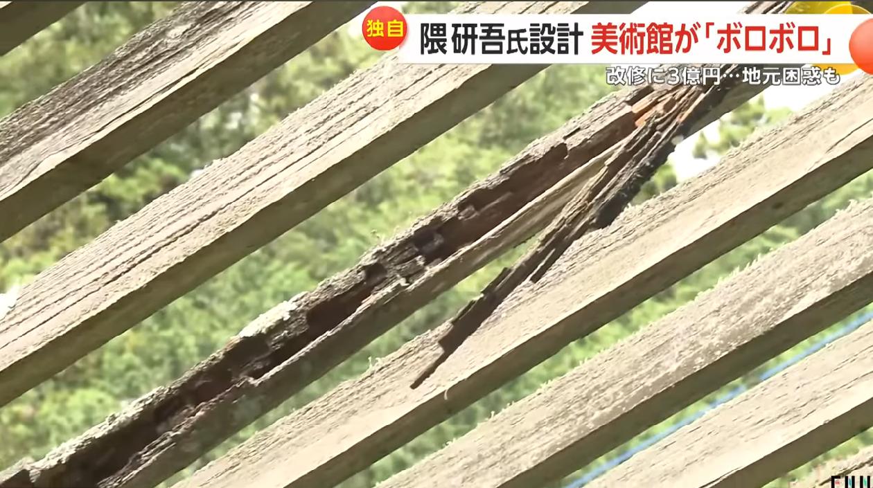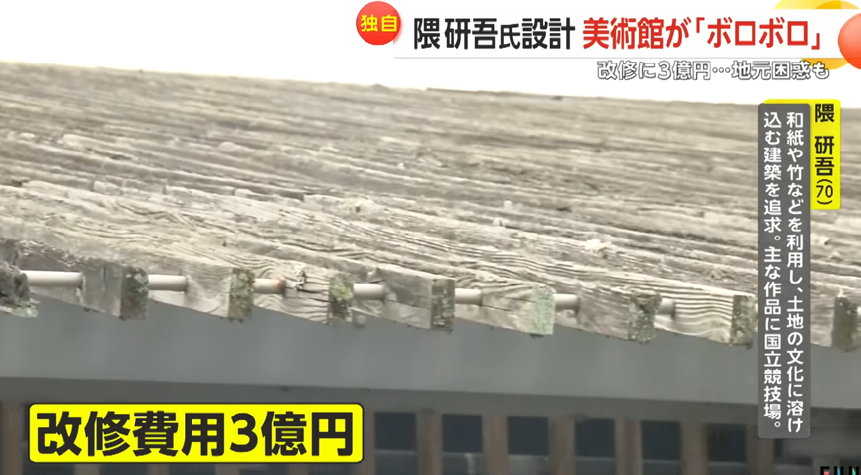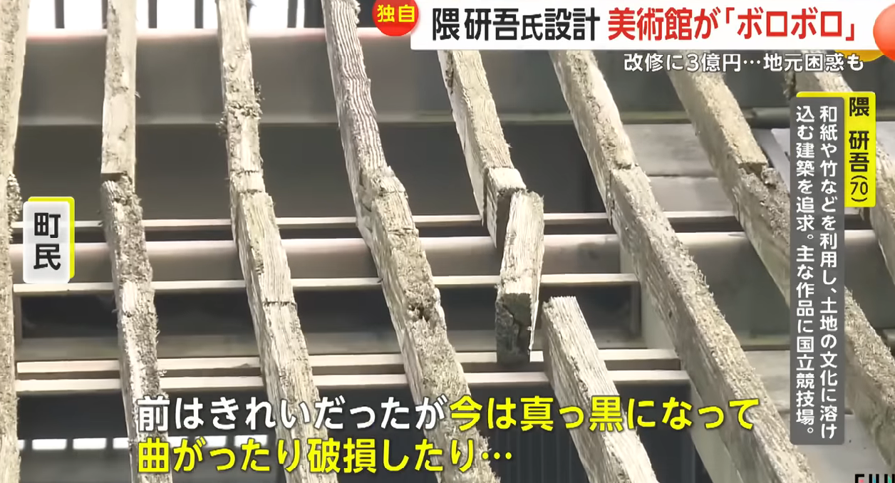 【悲報】隈研吾さん設計の材木並べた建築、腐ってボロボロになってしまうwwwwwwwww