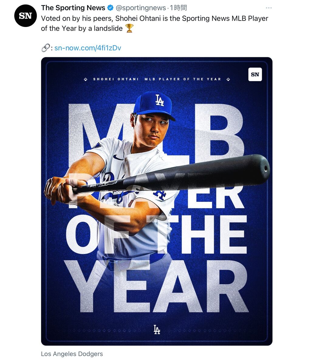 大谷翔平さん、スポーティングニュースによるMLB最優秀選手賞を受賞!!!