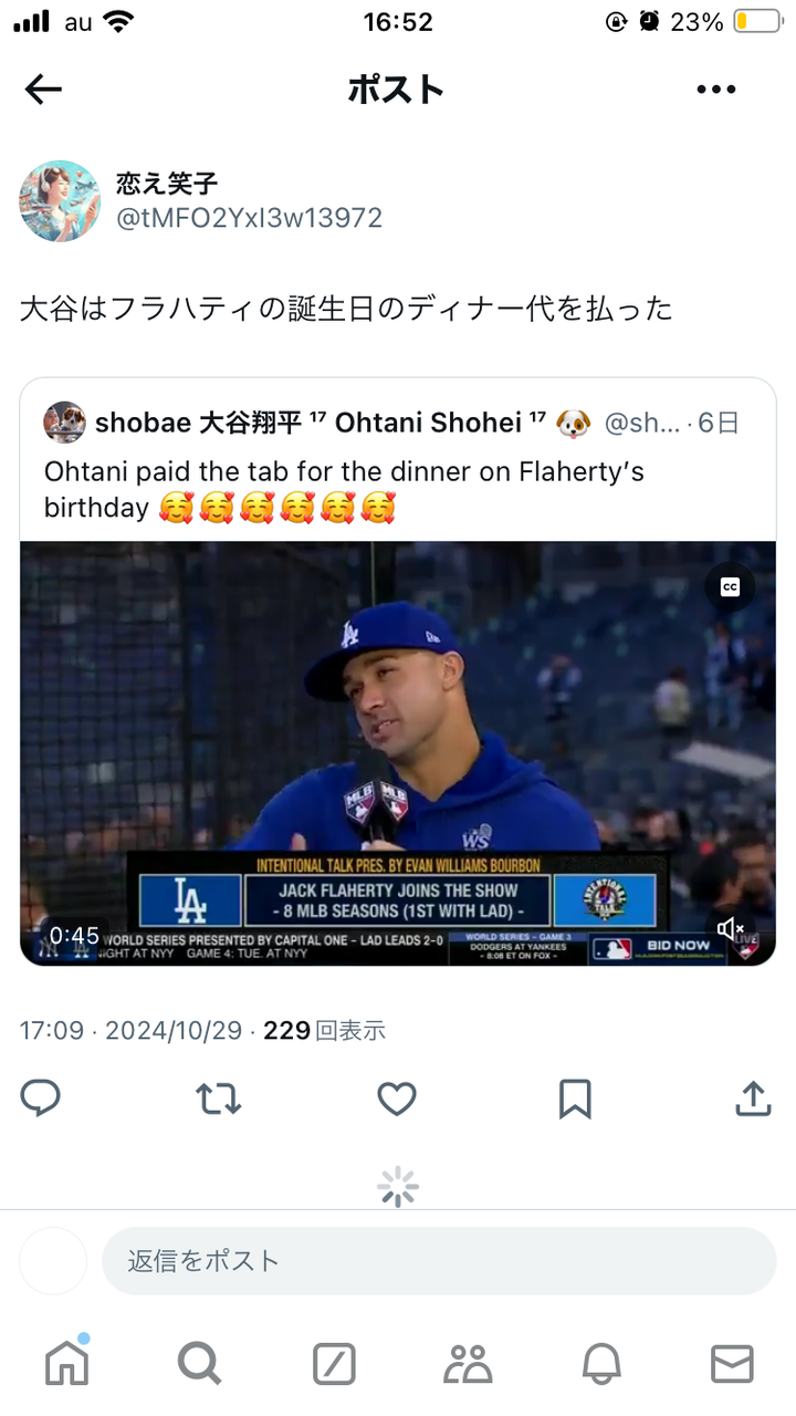 フラハティの誕生日にディナーを奢った大谷