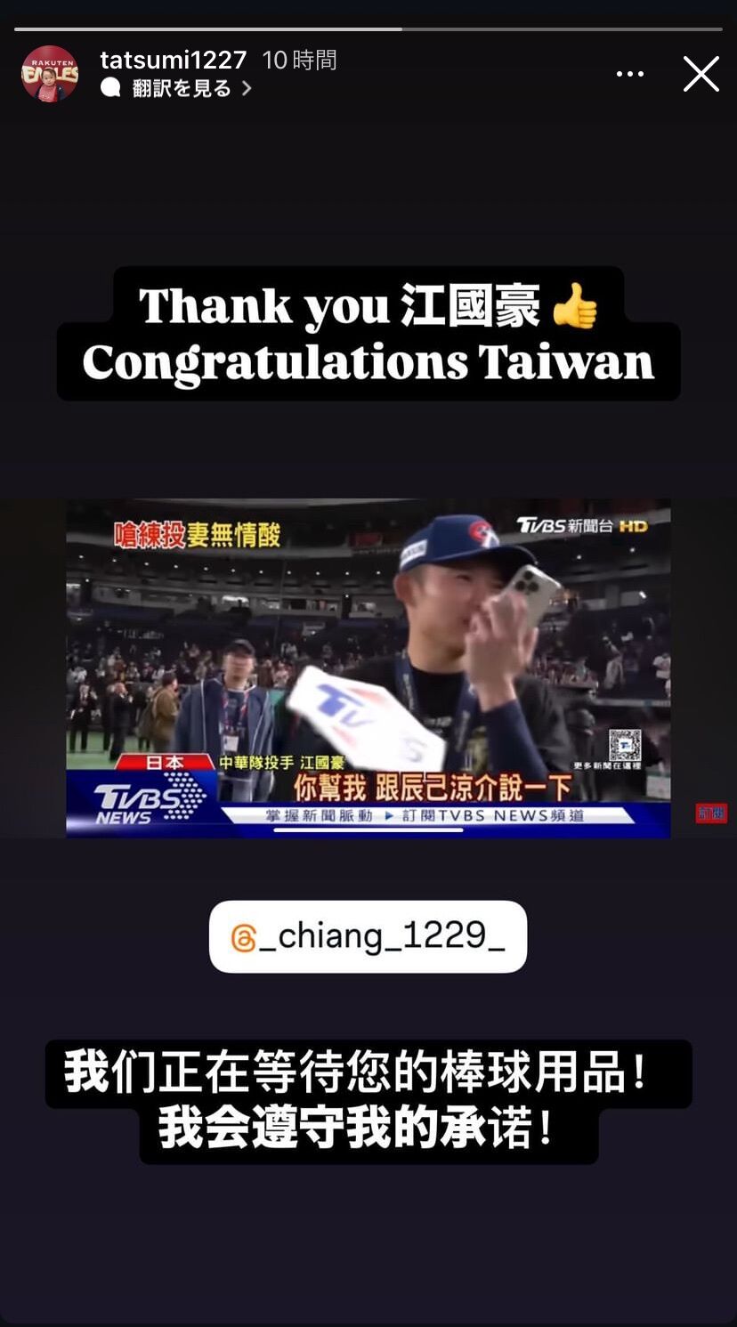 台湾代表選手「辰己にグローブを送るから投手の練習しろ🤣」辰己「グローブ待ってます!」