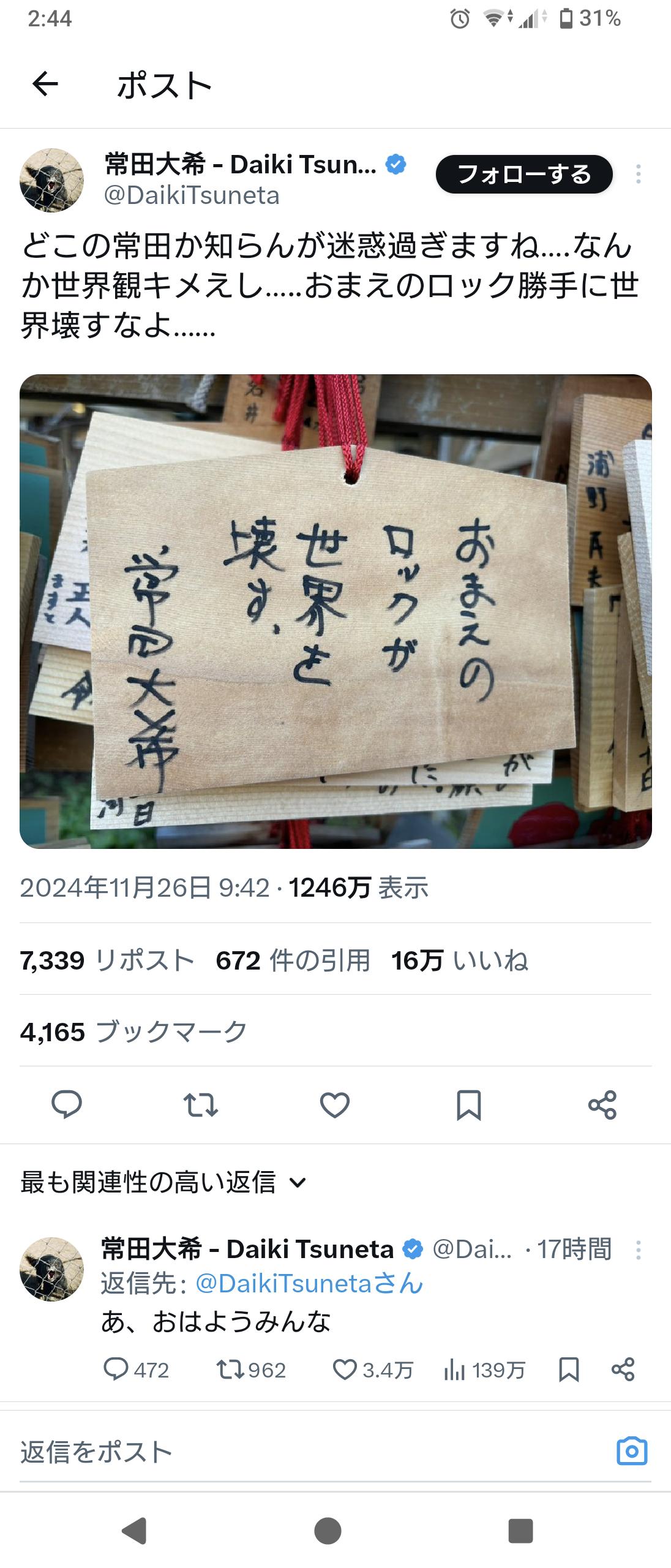 King Gnuの常田大希、同姓同名の絵馬を罵ってしまう