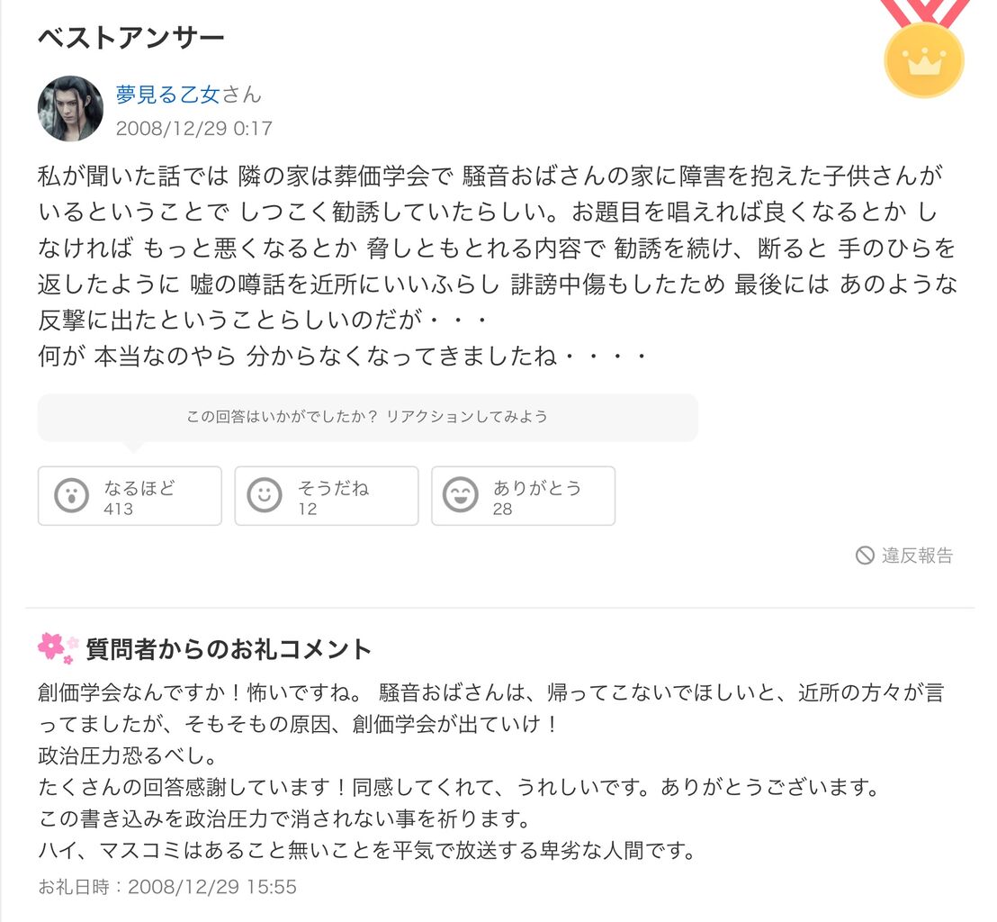 私が聞いた話では 隣の家は葬価学会で 騒音おばさんの家に障害を抱えた子供さんがいるということで しつこく勧誘していたらしい。お題目を唱えれば良くなるとか しなければ もっと悪くなるとか 脅しともとれる内容で 勧誘を続け、断ると 手のひらを返したように 嘘の噂話を近所にいいふらし 誹謗中傷もしたため 最後には あのような反撃に出たということらしいのだが・・・
