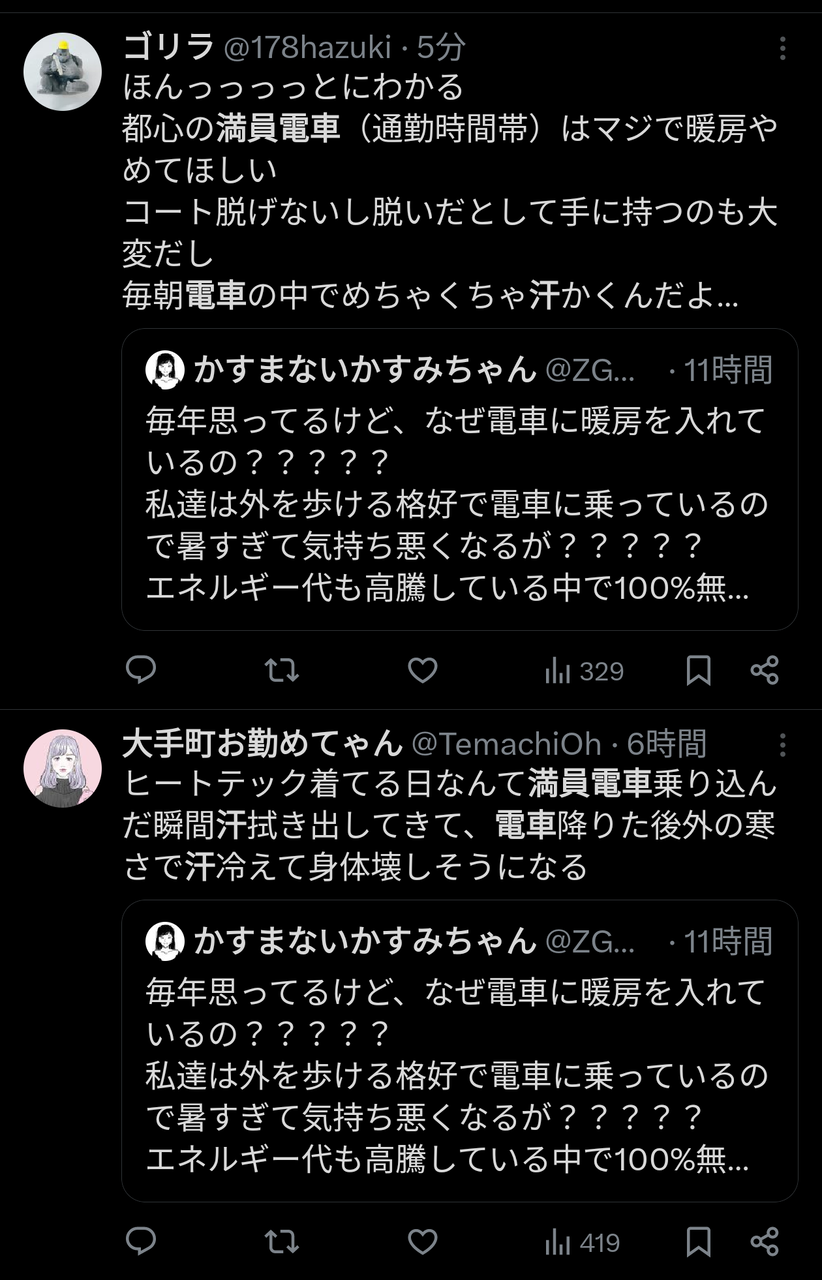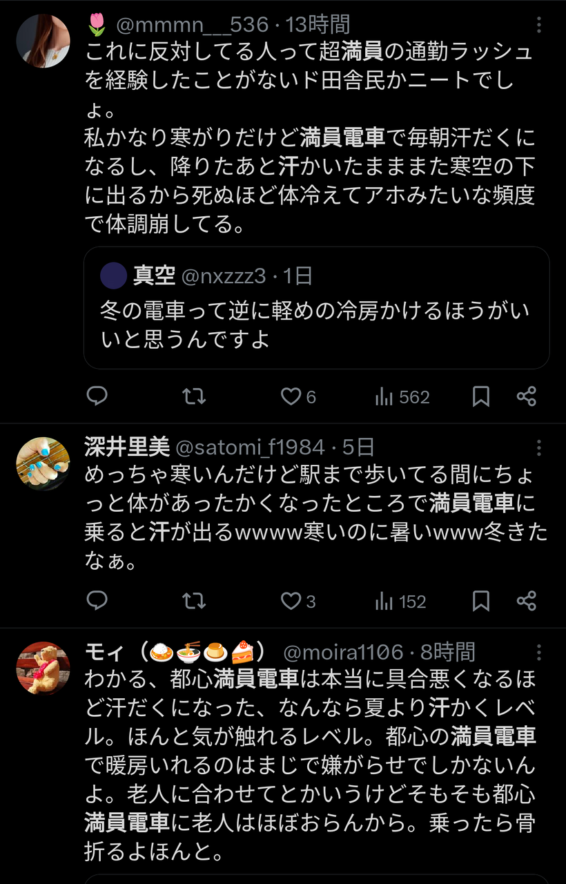 【悲報】東京人さんブチギレ「冬の満員電車で暖房つけるな!」→暑すぎて冷房を要求wwwww