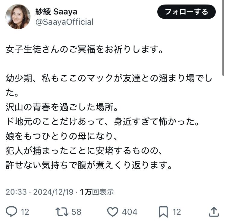 同市出身の紗綾は、「女子生徒さんのご冥福をお祈りします」と被害者を追悼するとともに、「幼少期、私もここのマックが友達との溜まり場でした。沢山の青春を過ごした場所」と明かし、「ド地元のことだけあって、身近すぎて怖かった。娘をもつひとりの母になり、犯人が捕まったことに安堵するものの、許せない気持ちで腹が煮えくり返ります」と思いをつづった。
