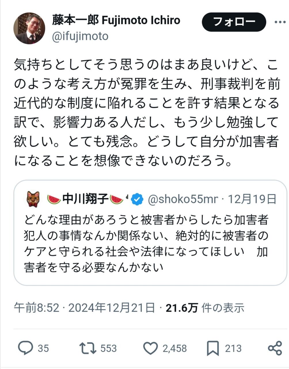 気持ちとしてそう思うのはまあ良いけど、このような考え方が冤罪を生み、刑事裁判を前近代的な制度に陥れることを許す結果となる訳で、影響力ある人だし、もう少し勉強して欲しい。とても残念。どうして自分が加害者になることを想像できないのだろう。