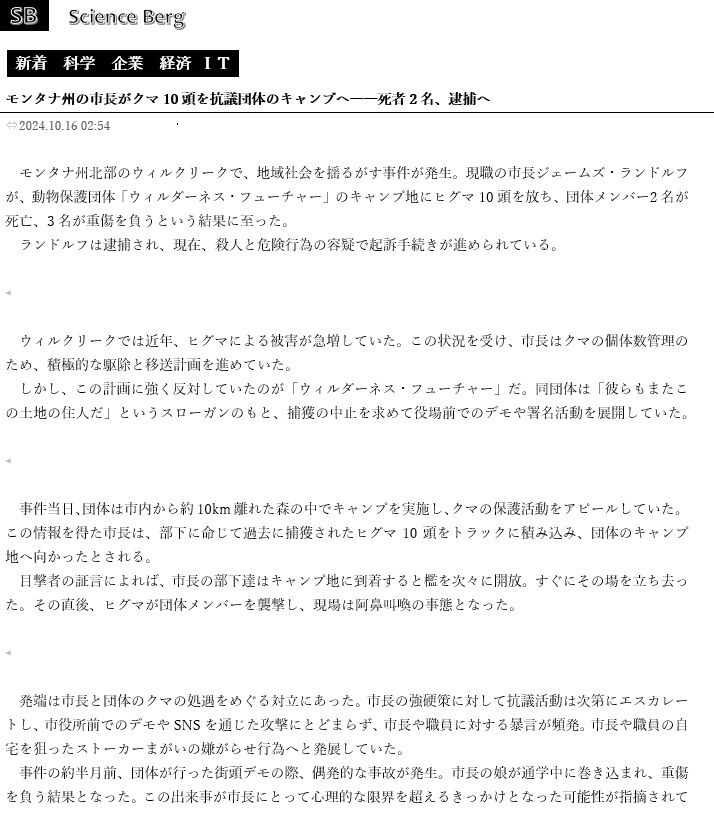 >>モンタナ州の市長がクマ10頭を抗議団体のキャンプへ――死者2名、逮捕へ