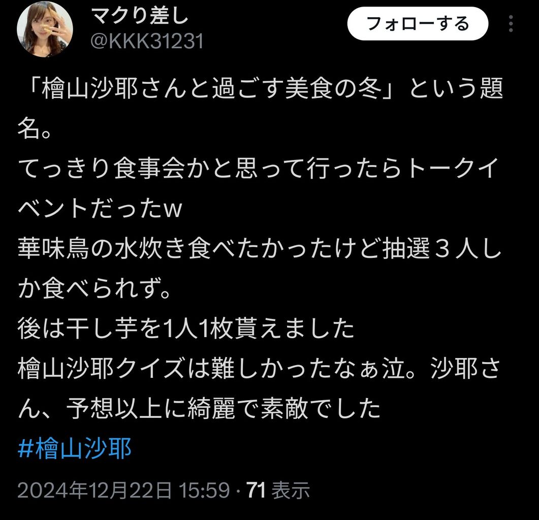 檜山沙耶(おさや)の美食イベント(会費7000円)で参加者に干し芋が1枚振る舞われる