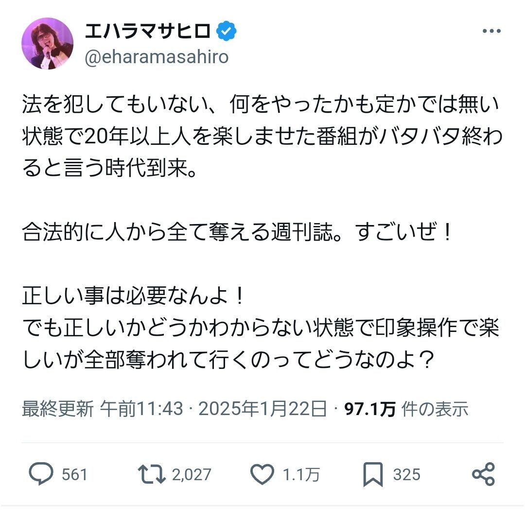 【悲報】エハラマサヒロさん、文春に正論「法を犯してもいない人から全てを奪える週刊誌。すごいぜ!」
