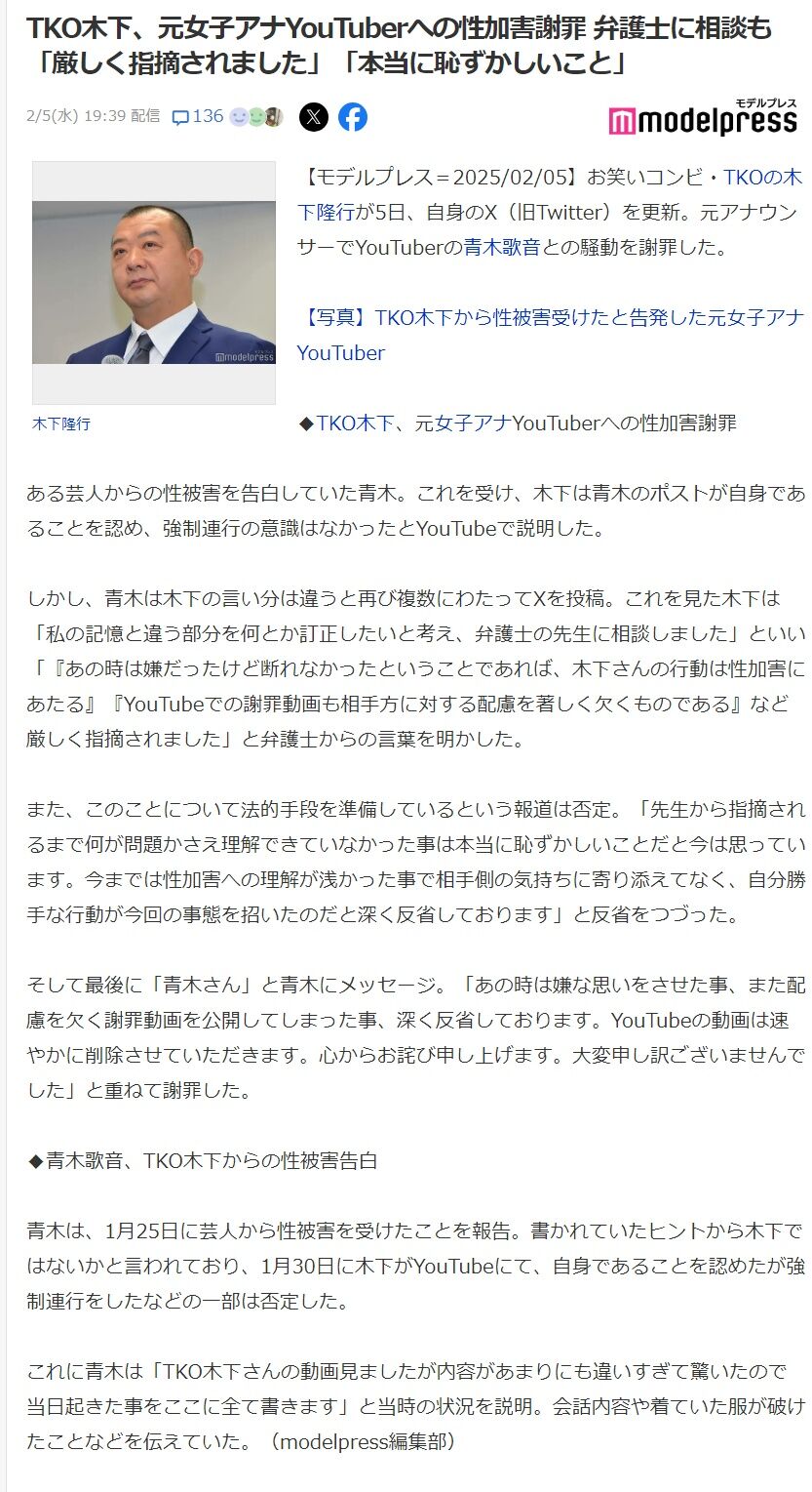 TKO木下さん、弁護士に相談するも「あなたの行動は性加害です」と説教される