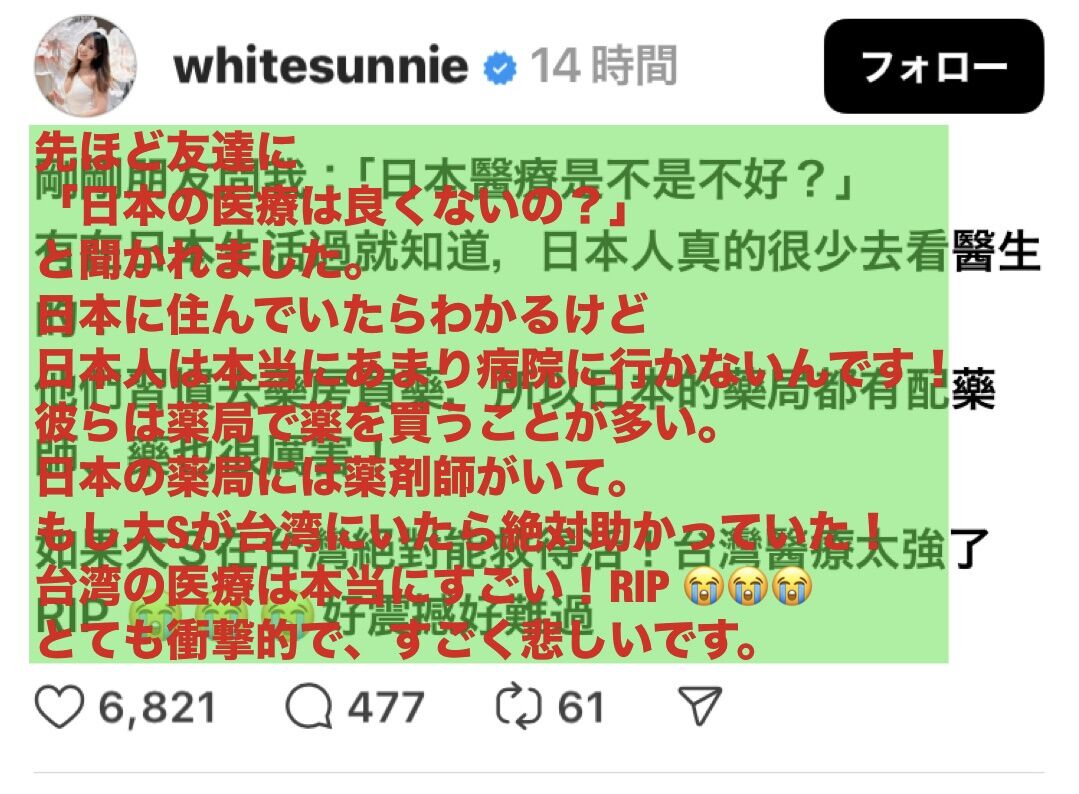 【悲報】台湾の有名女優が日本で死亡し、台湾人激怒「日本の医療は途上国レベル」