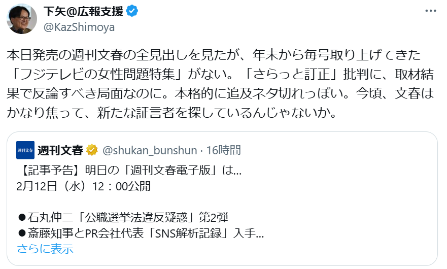 【悲報】週刊文春のフジ中居追及、ネタ切れ。標的は斎藤・石丸へ