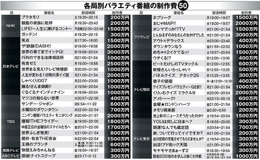 【画像】テレビ番組の制作費wwwwwwwwwwwwwwwww