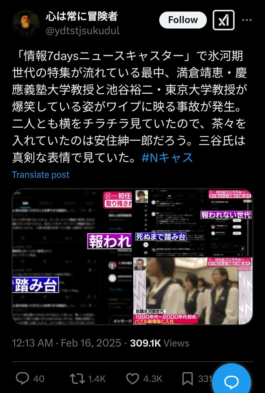 【悲報】TBSのコメンテーター、氷河期世代特集で爆笑してしまい炎上🔥