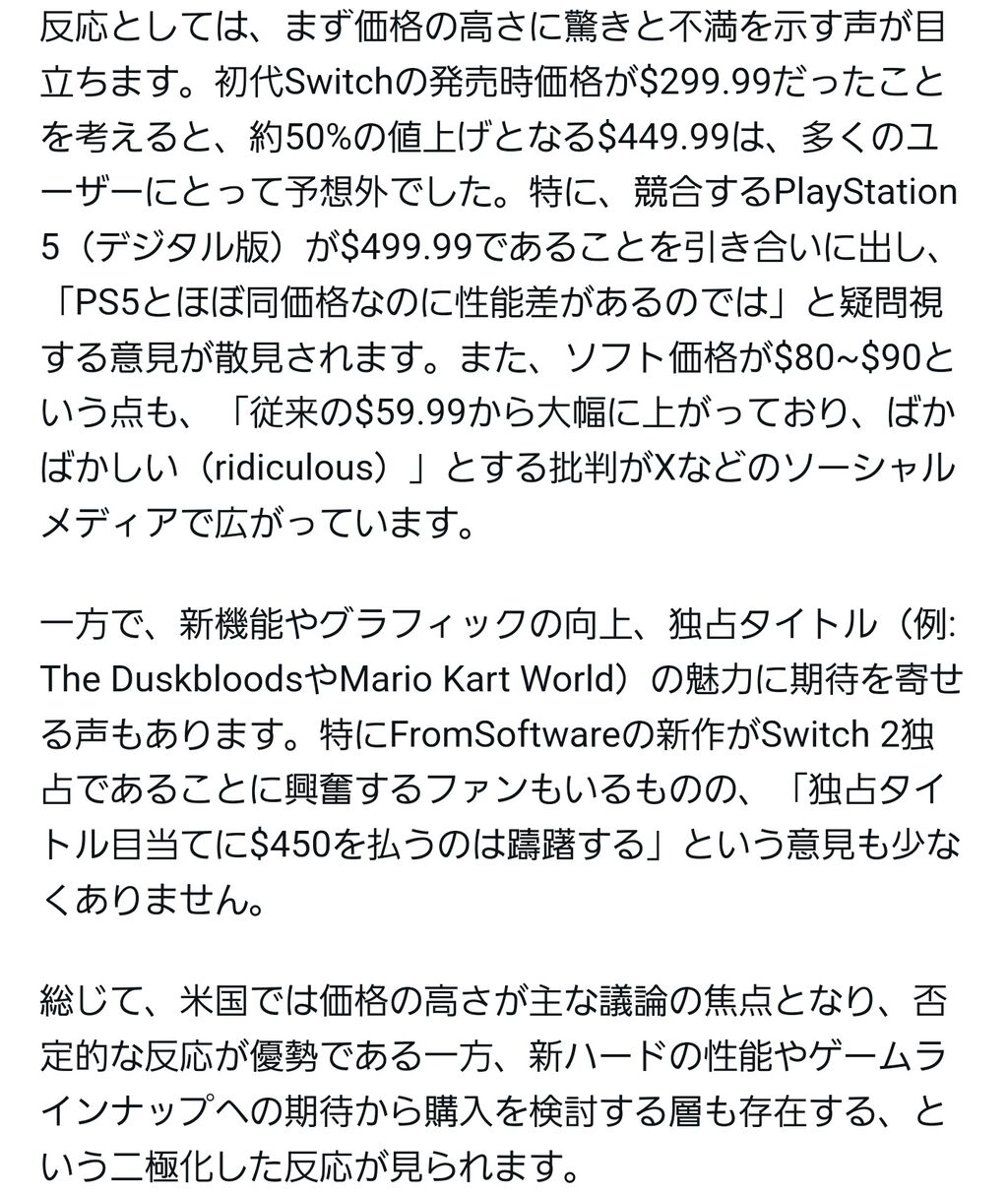 総じて、米国では価格の高さが主な議論の焦点となり、否定的な反応が優勢である一方、新ハードの性能やゲームラインナップへの期待から購入を検討する層も存在する、という二極化した反応が見られます。