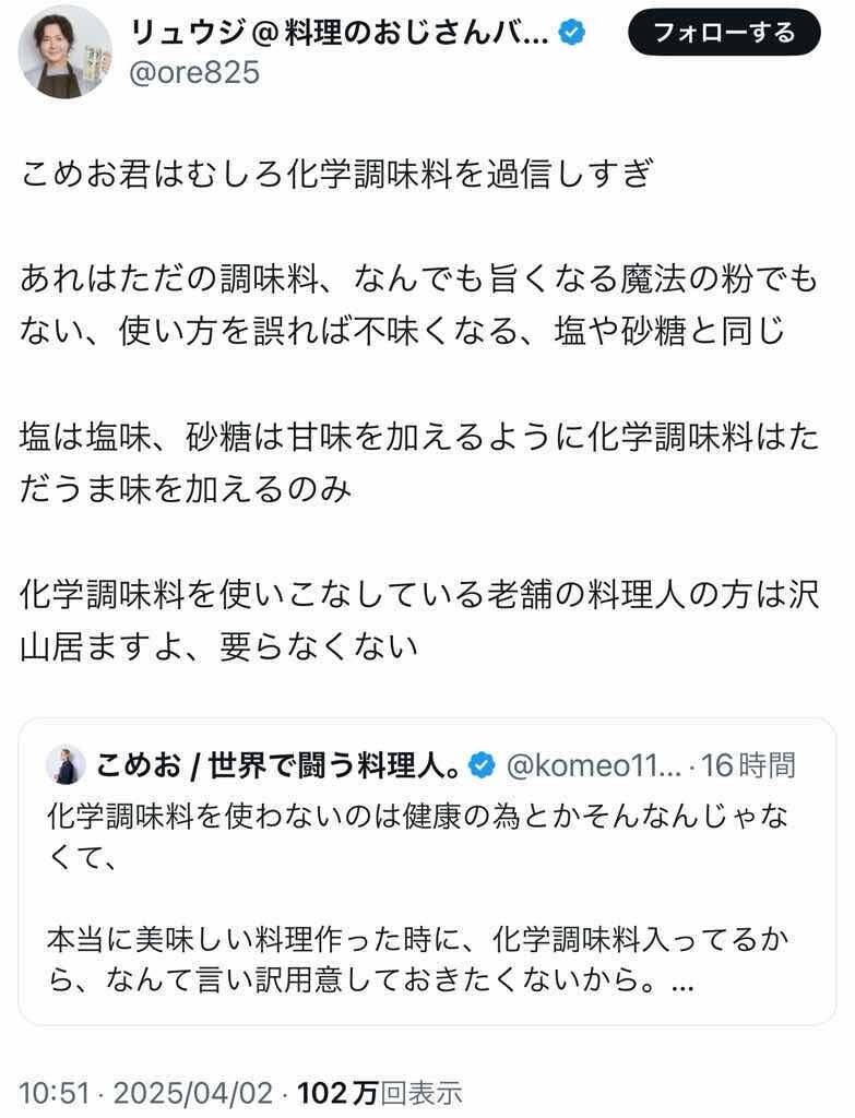 こめお「客に化学調味料入ってるからかって思われるのが嫌」リュウジ「うま味を加える調味料なだけ」