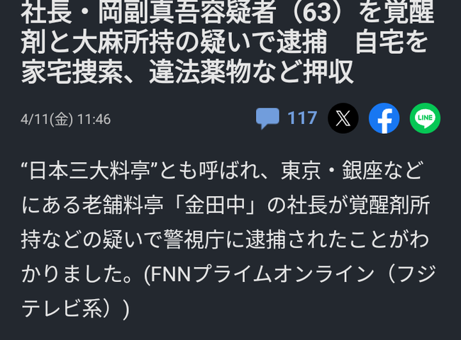 【速報】老舗料亭の社長が覚せい剤所持で逮捕。(かなりすごい人らしい)