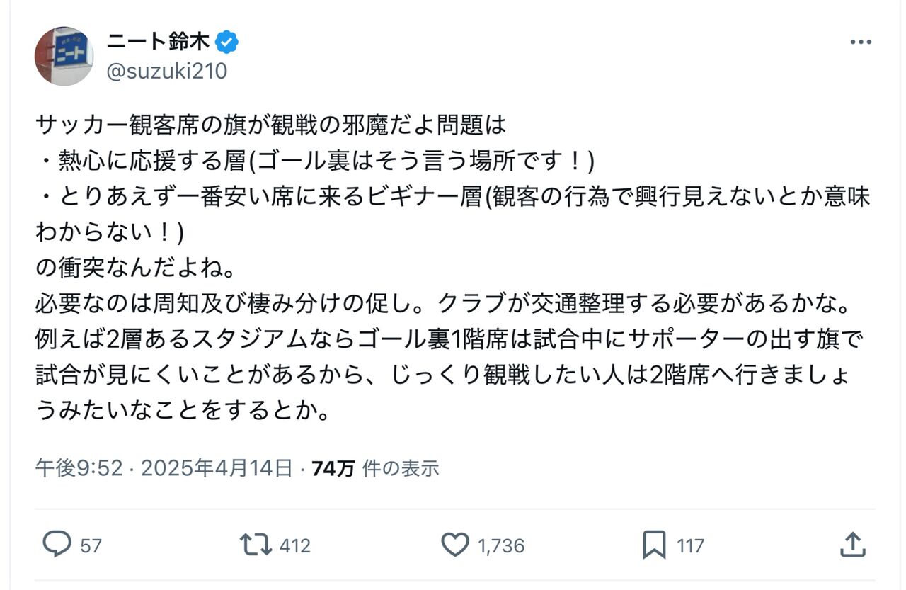 一般客「Jリーグは旗が邪魔。何も見えない。」→サポーター「ゴール裏はそういうもの。お前が邪魔」