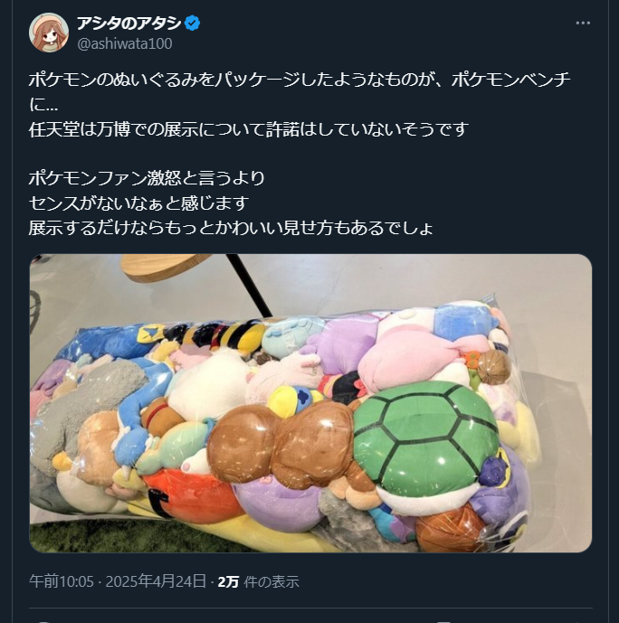 「可哀想すぎる」大阪万博の“ぬいぐるみベンチ”展示にポケモンファン激怒、任天堂は直撃に「許諾したものではないので…」