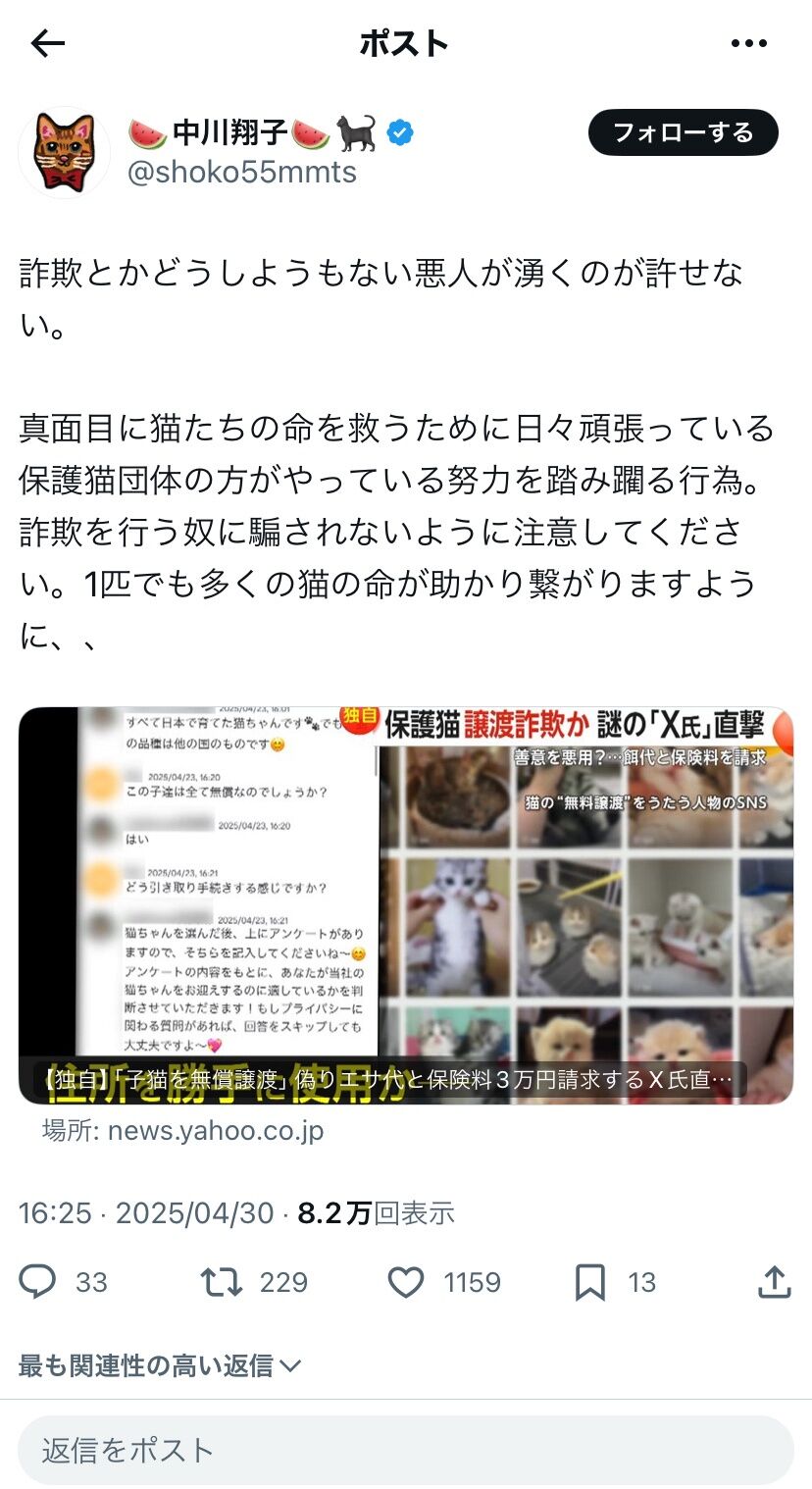 「猫をダシにして稼ぐ詐欺師が許せない!」中川翔子が注意喚起