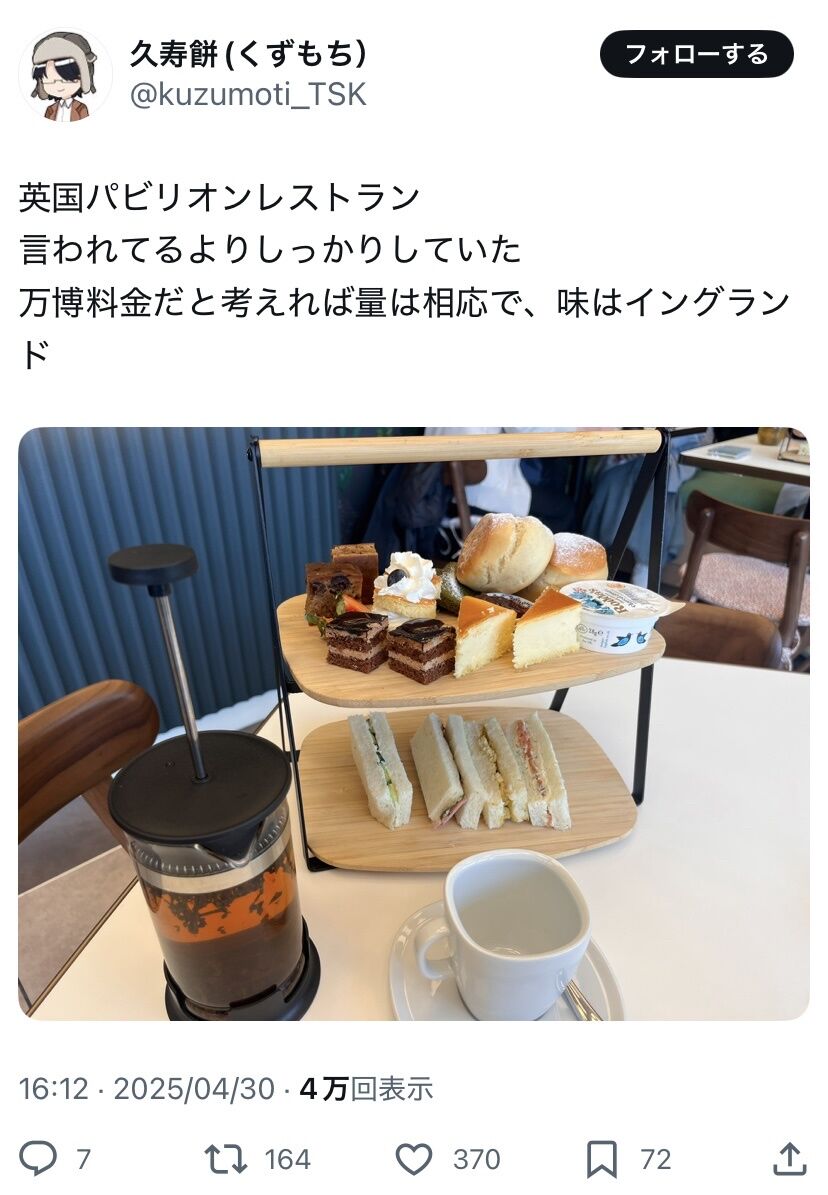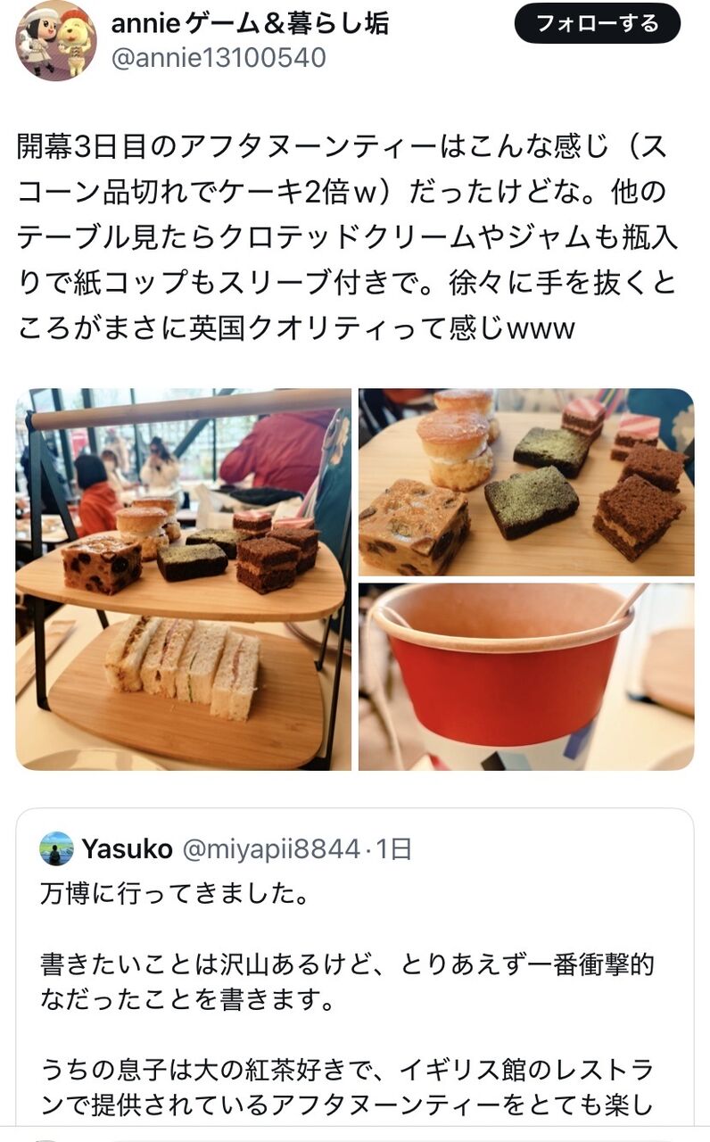 【画像】万博のイギリス館 アフタヌーンティーセット5000円、紙コップからマグカップに戻る