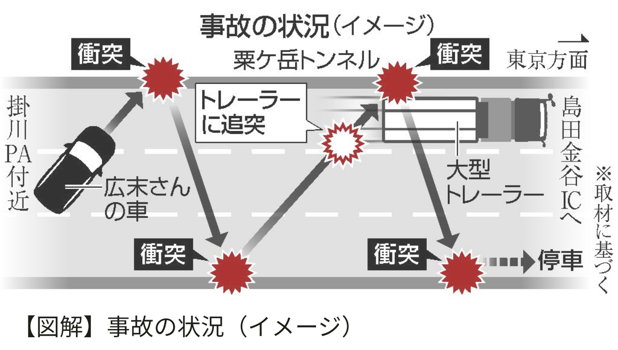 捜査関係者によると、広末さんが運転する車はトンネル内を走行中、左側壁に衝突。その反動で車線を横断して反対側の壁に衝突し、さらに前方の大型トレーラーに追突した。その後、再び左右の壁に衝突後、右側の壁に沿って停車したとみられる。