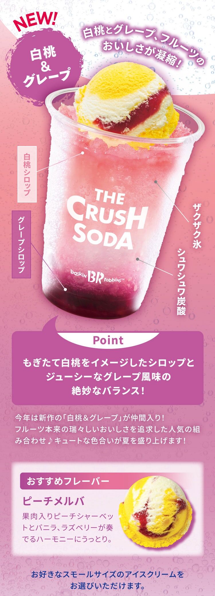 もぎたて白桃をイメージしたシロップとジューシーなグレープ風味の絶妙なバランス!今年は新作の「白桃&グレープ」が仲間入り!フルーツ本来の瑞々しいおいしさを追求した人気の組み合わせ♪キュートな色合いが夏を盛り上げます!