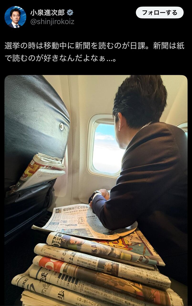 【画像】小泉進次郎「移動中は新聞を読むのが好き。」←話題になるwwwwwwwww