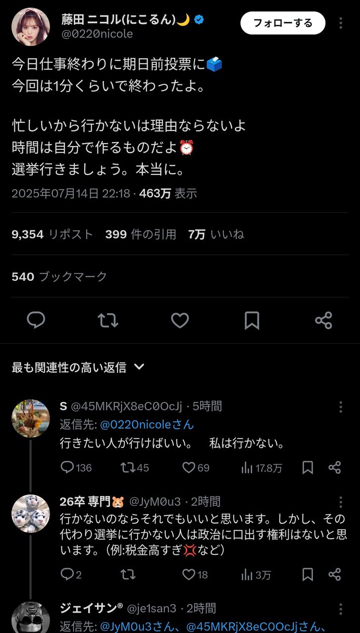 藤田ニコルちゃん「時間がないは理由にならないよ⏰選挙に行きましょう」